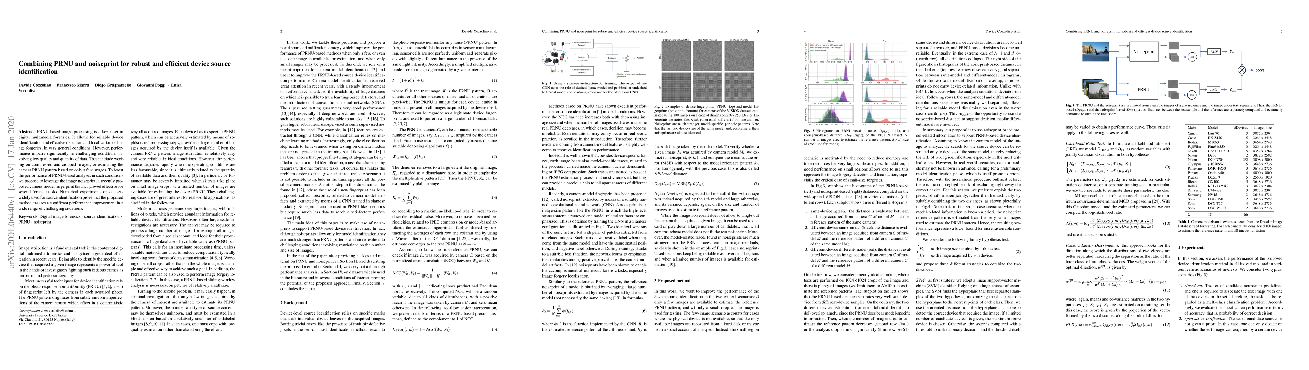 This paper proposes combining the PRNU (Pixel-level Random Noise Underlay) with the image noiseprint to enhance device source identification under challenging conditions, such as low-quality and limited data scenarios. The integration significantly improves performance in identifying camera models and detecting image forgeries.