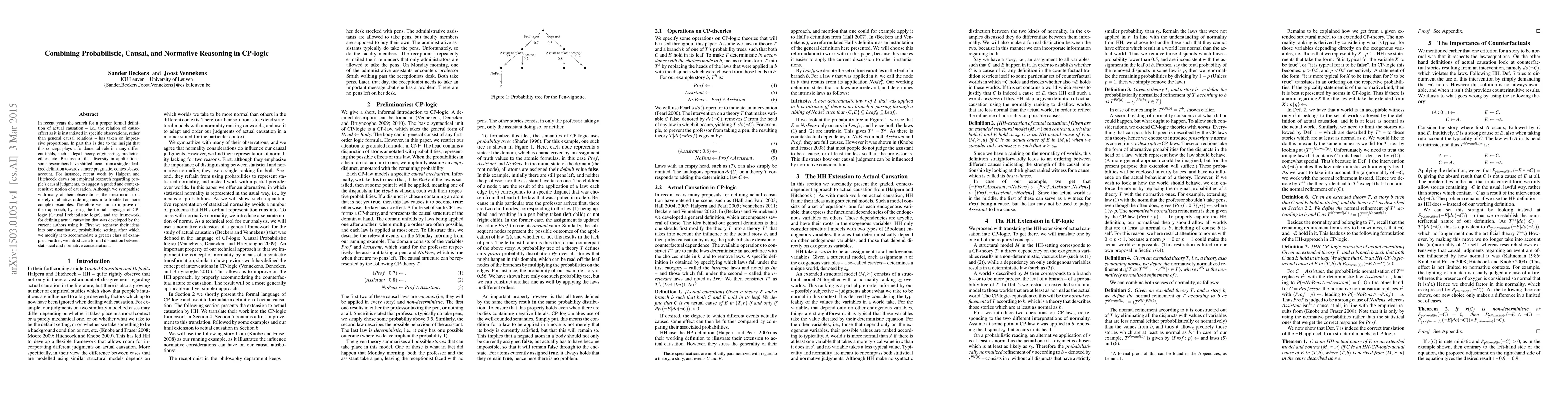 This paper proposes an enhanced framework in CP-logic to define actual causation, integrating probabilistic, causal, and normative reasoning to better handle complex examples and distinguish between statistical and normative aspects. It builds on previous work by Halpern and Hitchcock, refining their qualitative approach into a quantitative, context-sensitive model.