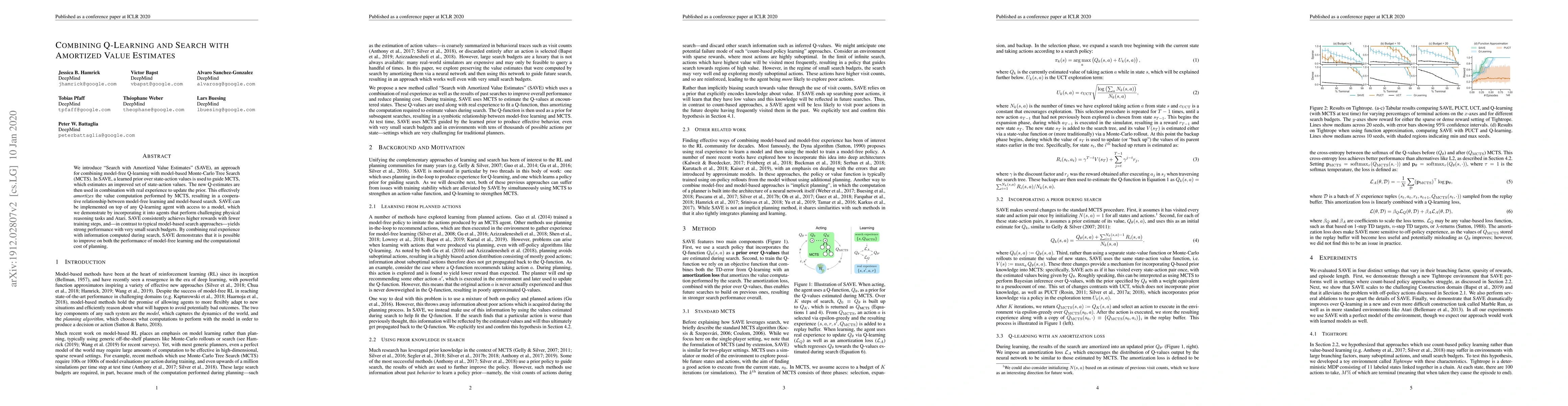 A new approach called Search with Amortized Value Estimates (SAVE) combines model-free Q-learning with model-based Monte-Carlo Tree Search to improve performance and reduce computational cost in reinforcement learning tasks.