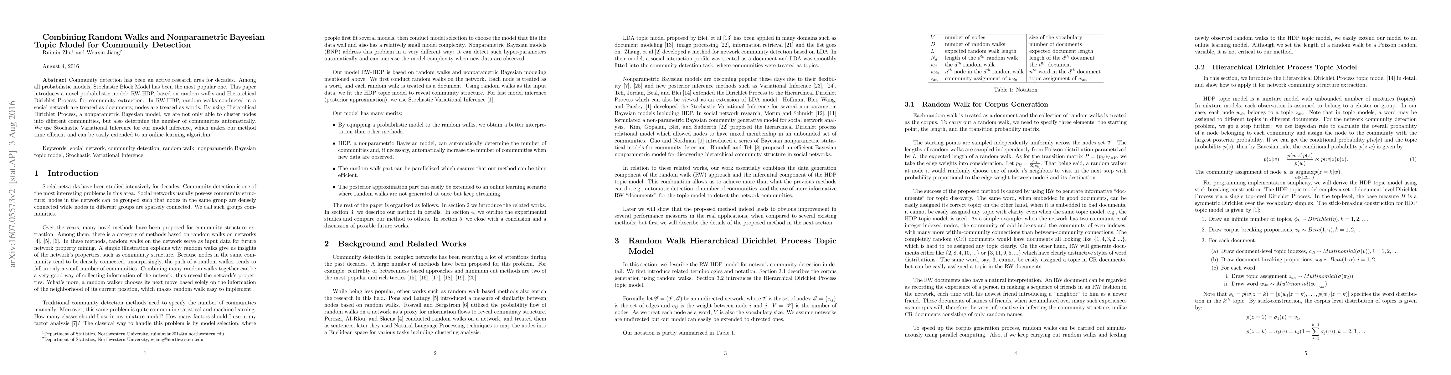 This paper proposes RW-HDP, a novel probabilistic model combining random walks and Hierarchical Dirichlet Process for community detection in social networks. The method clusters nodes into communities and determines the number of communities automatically, leveraging Stochastic Variational Inference for efficient inference.