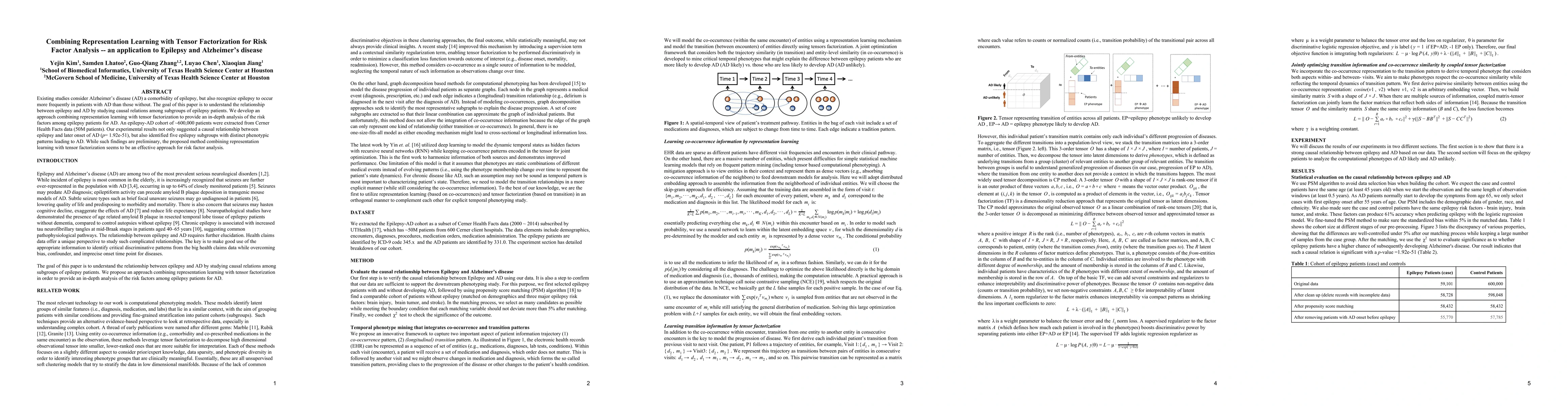 This paper develops a method combining representation learning with tensor factorization to analyze risk factors linking epilepsy and Alzheimer's disease. The study identifies causal relationships and distinct epilepsy subgroups associated with Alzheimer's, suggesting the approach's effectiveness for risk factor analysis in large datasets.
