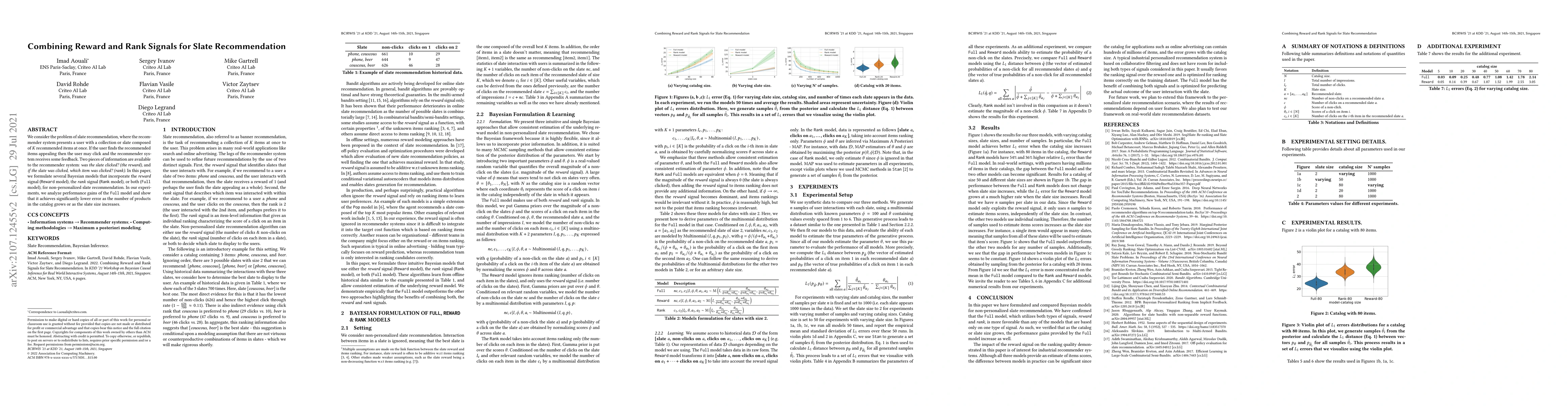 This paper proposes Bayesian models for slate recommendation that combine reward and rank signals to improve recommendation accuracy. The Full model, which integrates both signals, yields significant performance gains, especially as catalog size and slate size increase.