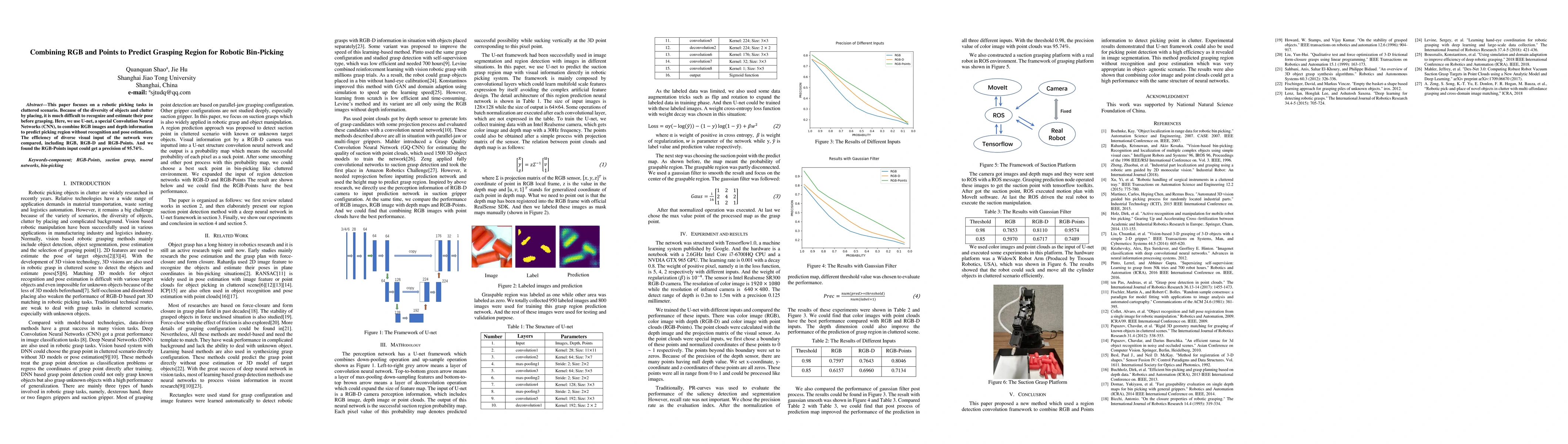 This paper proposes using a U-net CNN to combine RGB images and depth data to predict grasping regions for robotic bin-picking in cluttered environments. The study found that RGB-Points input achieved a precision of 95.74% in identifying grasping regions without requiring object recognition or pose estimation.