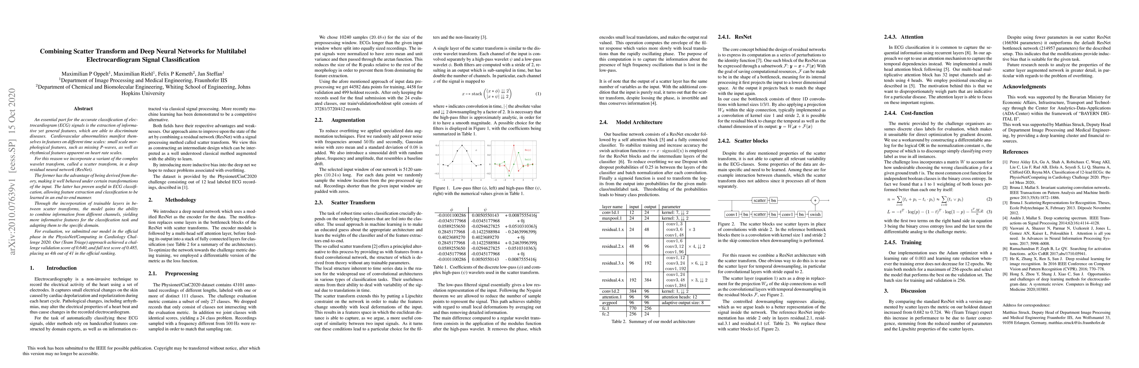 A novel approach combining scatter transform and deep neural networks achieves 0.640 challenge validation score and 0.485 full test score in ECG signal classification, ranking 4th out of 41.
