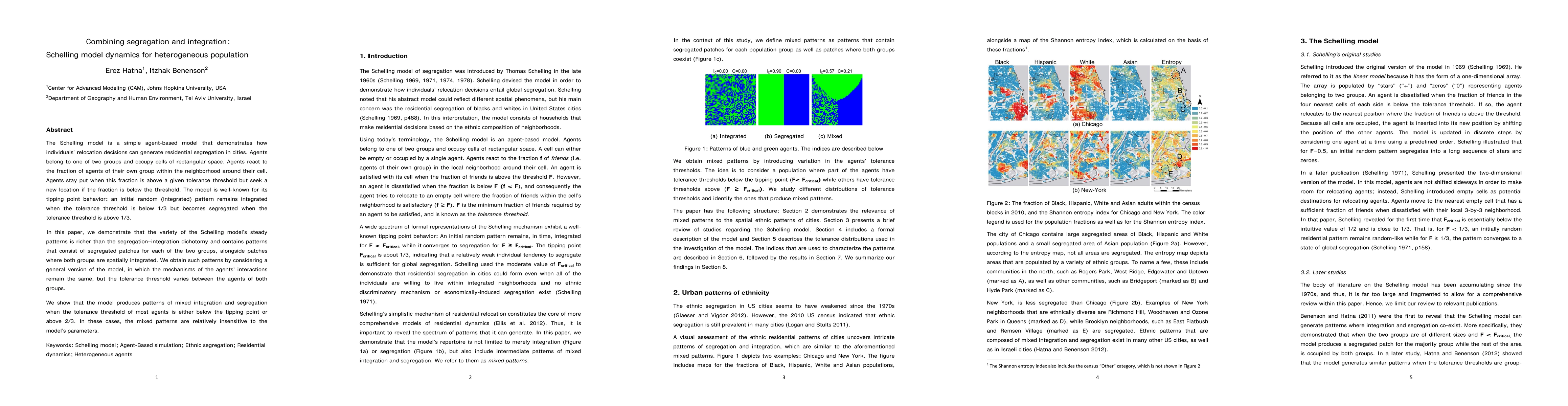 This paper explores the Schelling model dynamics to reveal that residential patterns can exhibit both segregation and integration, depending on varying tolerance thresholds among agents. It demonstrates that mixed patterns emerge when most agents' tolerance thresholds are either below or above the tipping point, showing the model's complexity beyond simple segregation or integration.