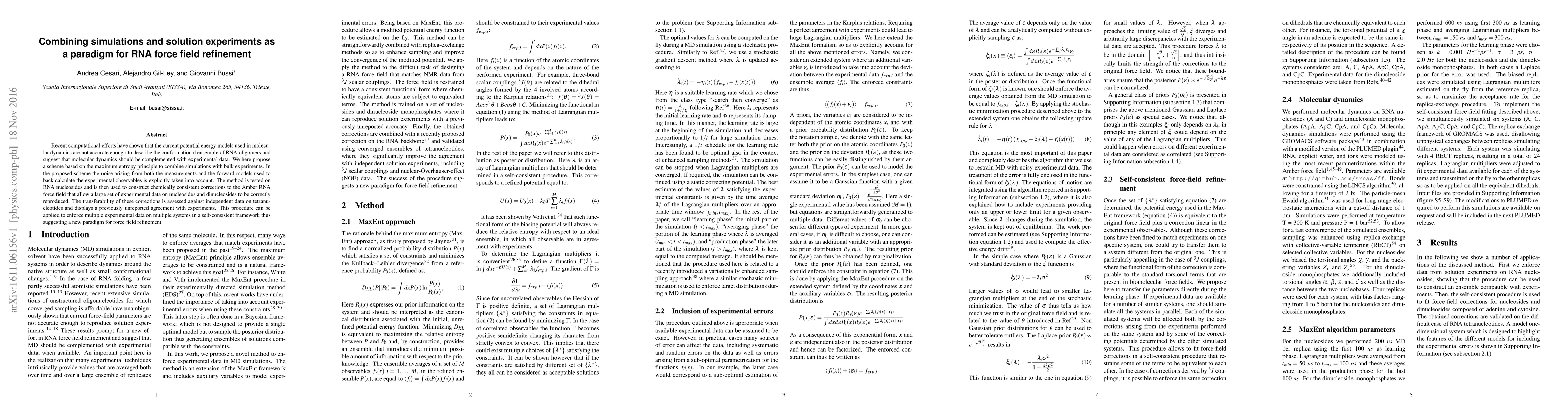 Recent computational efforts have shown that the current potential energy models used in molecular dynamics are not accurate enough to describe the conformational ensemble of RNA oligomers and suggest that molecular dynamics should be complemented with experimental data. We here propose a scheme based on the maximum entropy principle to combine simulations with bulk experiments. In the proposed scheme the noise arising from both the measurements and the forward models used to back calculate the experimental observables is explicitly taken into account. The method is tested on RNA nucleosides and is then used to construct chemically consistent corrections to the Amber RNA force field that allow a large set of experimental data on nucleosides and dinucleosides to be correctly reproduced. The transferability of these corrections is assessed against independent data on tetranucleotides and displays a previously unreported agreement with experiments. This procedure can be applied to enforce multiple experimental data on multiple systems in a self-consistent framework thus suggesting a new paradigm for force field refinement.