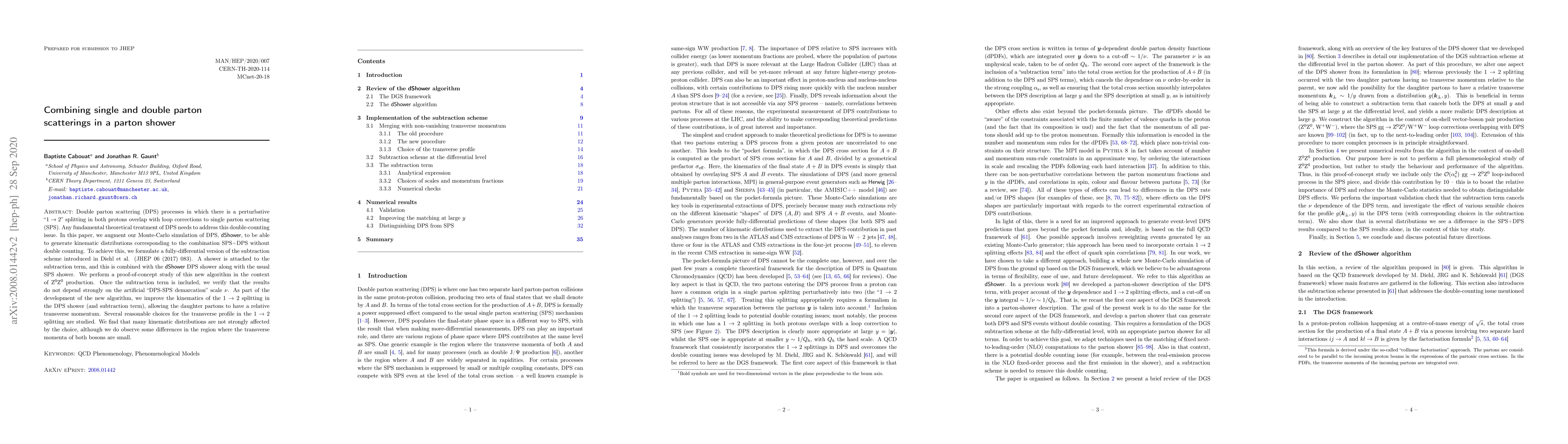 Double parton scattering (DPS) processes in which there is a perturbative $1\to2$ splitting in both protons overlap with loop corrections to single parton scattering (SPS). Any fundamental theoretical treatment of DPS needs to address this double-counting issue. In this paper, we augment our Monte-Carlo simulation of DPS, dShower, to be able to generate kinematic distributions corresponding to the combination SPS+DPS without double counting. To achieve this, we formulate a fully-differential version of the subtraction scheme introduced in Diehl et al. (JHEP 06 (2017) 083). A shower is attached to the subtraction term, and this is combined with the dShower DPS shower along with the usual SPS shower. We perform a proof-of-concept study of this new algorithm in the context of $\mathrm{Z}^0\mathrm{Z}^0$ production. Once the subtraction term is included, we verify that the results do not depend strongly on the artificial "DPS-SPS demarcation" scale $\nu$. As part of the development of the new algorithm, we improve the kinematics of the $1\to2$ splitting in the DPS shower (and subtraction term), allowing the daughter partons to have a relative transverse momentum. Several reasonable choices for the transverse profile in the $1\to2$ splitting are studied. We find that many kinematic distributions are not strongly affected by the choice, although we do observe some differences in the region where the transverse momenta of both bosons are small.