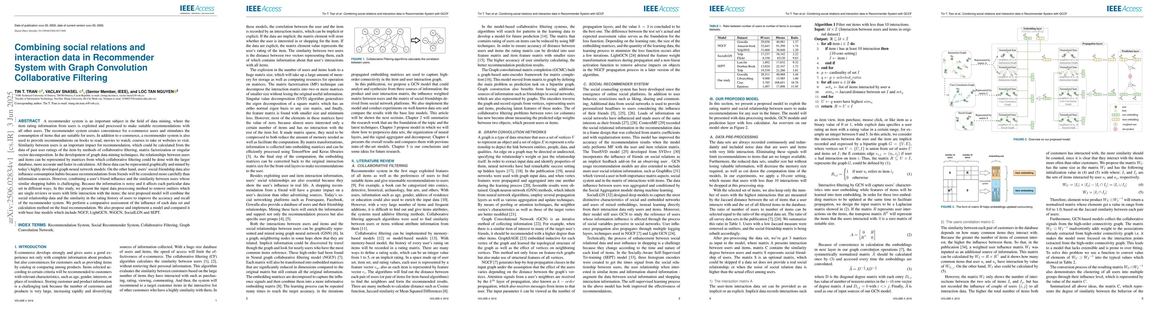 A recommender system is an important subject in the field of data mining, where the item rating information from users is exploited and processed to make suitable recommendations with all other users. The recommender system creates convenience for e-commerce users and stimulates the consumption of items that are suitable for users. In addition to e-commerce, a recommender system is also used to provide recommendations on books to read, movies to watch, courses to take or websites to visit. Similarity between users is an important impact for recommendation, which could be calculated from the data of past user ratings of the item by methods of collaborative filtering, matrix factorization or singular vector decomposition. In the development of graph data mining techniques, the relationships between users and items can be represented by matrices from which collaborative filtering could be done with the larger database, more accurate and faster in calculation. All these data can be represented graphically and mined by today's highly developed graph neural network models. On the other hand, users' social friendship data also influence consumption habits because recommendations from friends will be considered more carefully than information sources. However, combining a user's friend influence and the similarity between users whose similar shopping habits is challenging. Because the information is noisy and it affects each particular data set in different ways. In this study, we present the input data processing method to remove outliers which are single reviews or users with little interaction with the items; the next proposed model will combine the social relationship data and the similarity in the rating history of users to improve the accuracy and recall of the recommender system.