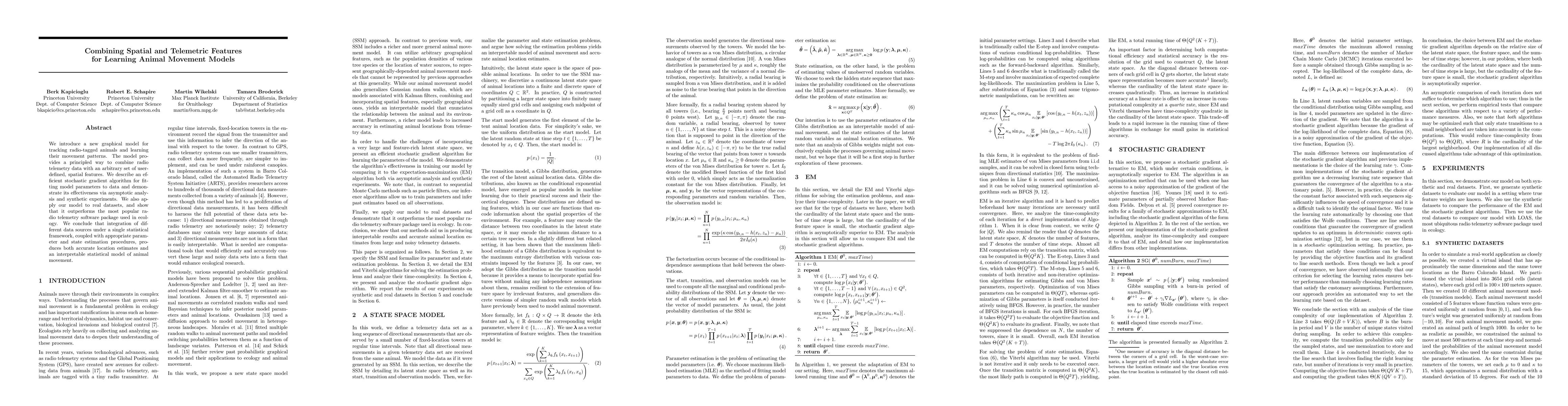 We introduce a new graphical model for tracking radio-tagged animals and learning their movement patterns. The model provides a principled way to combine radio telemetry data with an arbitrary set of userdefined, spatial features. We describe an efficient stochastic gradient algorithm for fitting model parameters to data and demonstrate its effectiveness via asymptotic analysis and synthetic experiments. We also apply our model to real datasets, and show that it outperforms the most popular radio telemetry software package used in ecology. We conclude that integration of different data sources under a single statistical framework, coupled with appropriate parameter and state estimation procedures, produces both accurate location estimates and an interpretable statistical model of animal movement.