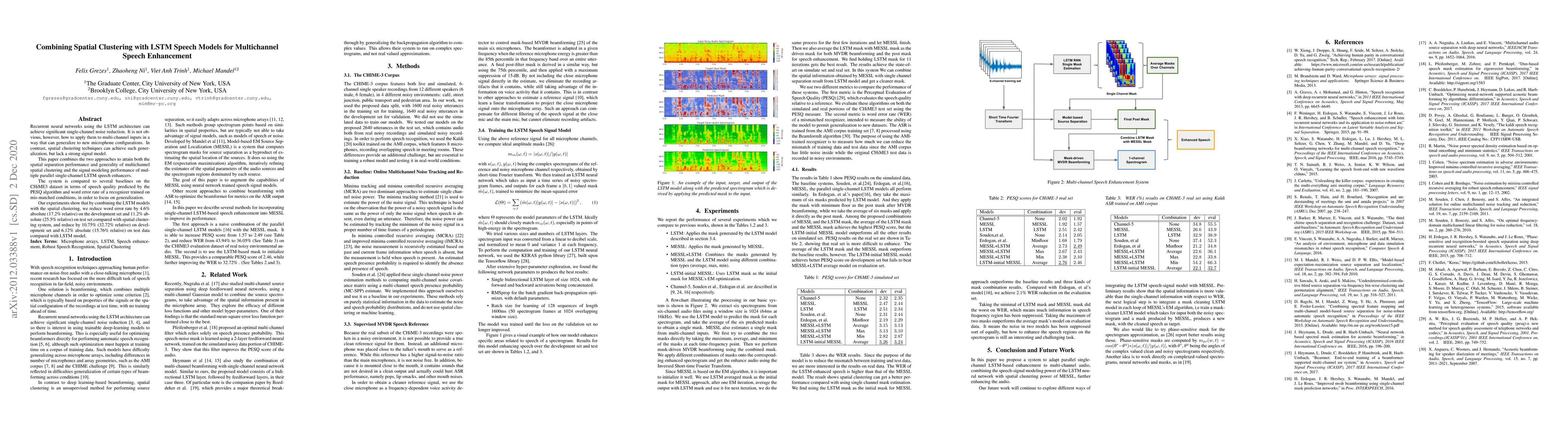 Recurrent neural networks using the LSTM architecture can achieve significant single-channel noise reduction. It is not obvious, however, how to apply them to multi-channel inputs in a way that can generalize to new microphone configurations. In contrast, spatial clustering techniques can achieve such generalization, but lack a strong signal model. This paper combines the two approaches to attain both the spatial separation performance and generality of multichannel spatial clustering and the signal modeling performance of multiple parallel single-channel LSTM speech enhancers. The system is compared to several baselines on the CHiME3 dataset in terms of speech quality predicted by the PESQ algorithm and word error rate of a recognizer trained on mis-matched conditions, in order to focus on generalization. Our experiments show that by combining the LSTM models with the spatial clustering, we reduce word error rate by 4.6\% absolute (17.2\% relative) on the development set and 11.2\% absolute (25.5\% relative) on test set compared with spatial clustering system, and reduce by 10.75\% (32.72\% relative) on development set and 6.12\% absolute (15.76\% relative) on test data compared with LSTM model.