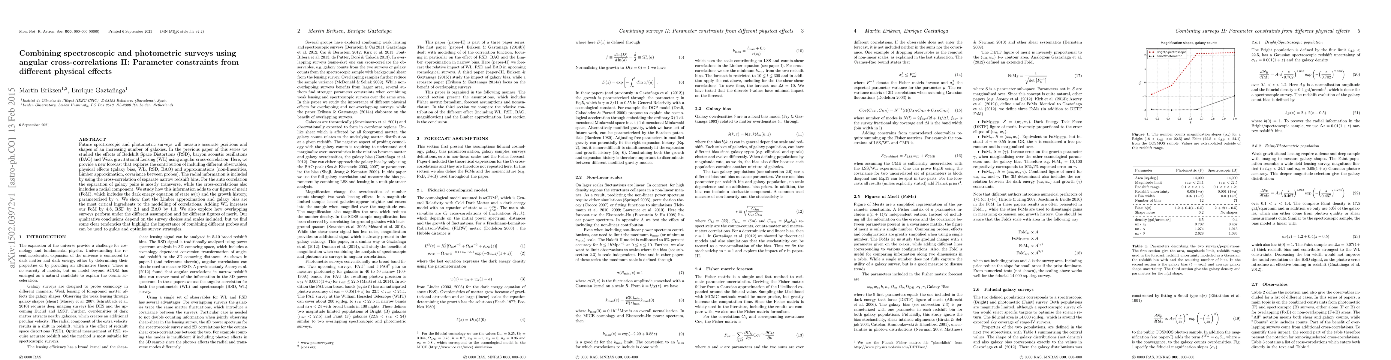This paper forecasts the parameter constraints from combining spectroscopic and photometric surveys using angular cross-correlations, emphasizing the contributions of galaxy bias, Weak Gravitational Lensing, Redshift Space Distortions, and Baryon Acoustic Oscillations. It finds that the Limber approximation and galaxy bias are crucial for modeling correlations, and that Weak Gravitational Lensing significantly enhances parameter figure of merit.