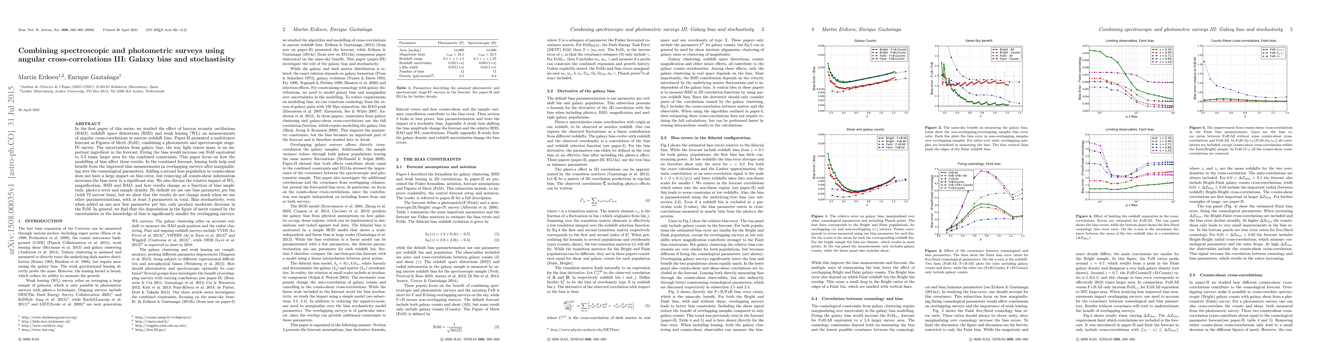 This paper investigates the impact of galaxy bias on the combined forecasts from spectroscopic and photometric surveys, showing that fixing bias can improve the Figure of Merit by a factor of 3.3. It finds that while bias stochasticity slightly reduces the forecast quality, the overall effect of bias uncertainties is less detrimental for overlapping surveys.