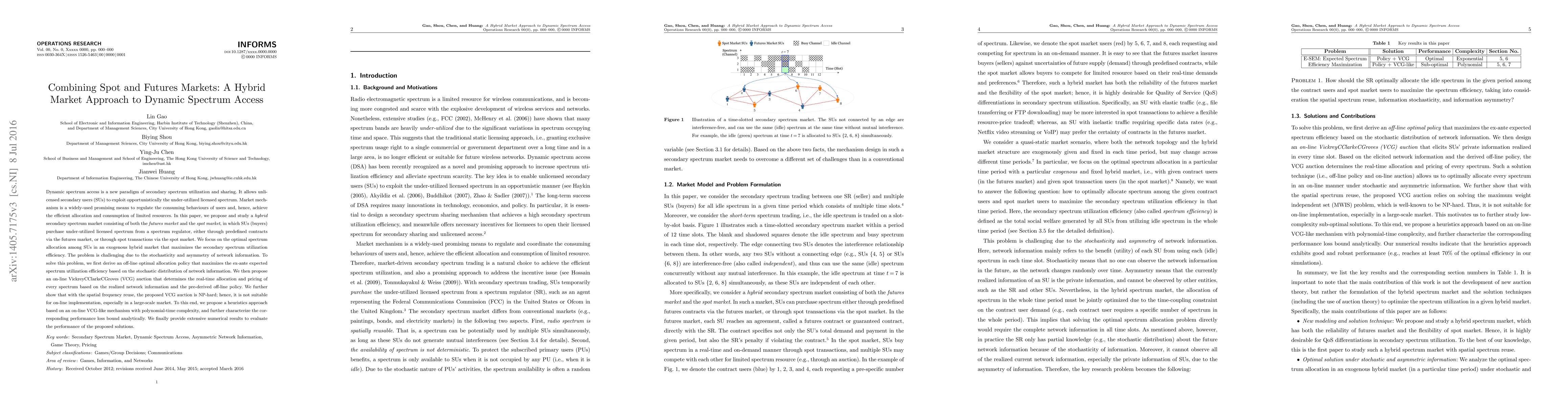 Dynamic spectrum access is a new paradigm of secondary spectrum utilization and sharing. It allows unlicensed secondary users (SUs) to exploit opportunistically the under-utilized licensed spectrum. Market mechanism is a widely-used promising means to regulate the consuming behaviours of users and, hence, achieves the efficient allocation and consumption of limited resources. In this paper, we propose and study a hybrid secondary spectrum market consisting of both the futures market and the spot market, in which SUs (buyers) purchase under-utilized licensed spectrum from a spectrum regulator, either through predefined contracts via the futures market, or through spot transactions via the spot market. We focus on the optimal spectrum allocation among SUs in an exogenous hybrid market that maximizes the secondary spectrum utilization efficiency. The problem is challenging due to the stochasticity and asymmetry of network information. To solve this problem, we first derive an off-line optimal allocation policy that maximizes the ex-ante expected spectrum utilization efficiency based on the stochastic distribution of network information. We then propose an on-line VickreyCClarkeCGroves (VCG) auction that determines the real-time allocation and pricing of every spectrum based on the realized network information and the pre-derived off-line policy. We further show that with the spatial frequency reuse, the proposed VCG auction is NP-hard; hence, it is not suitable for on-line implementation, especially in a large-scale market. To this end, we propose a heuristics approach based on an on-line VCG-like mechanism with polynomial-time complexity, and further characterize the corresponding performance loss bound analytically. We finally provide extensive numerical results to evaluate the performance of the proposed solutions.