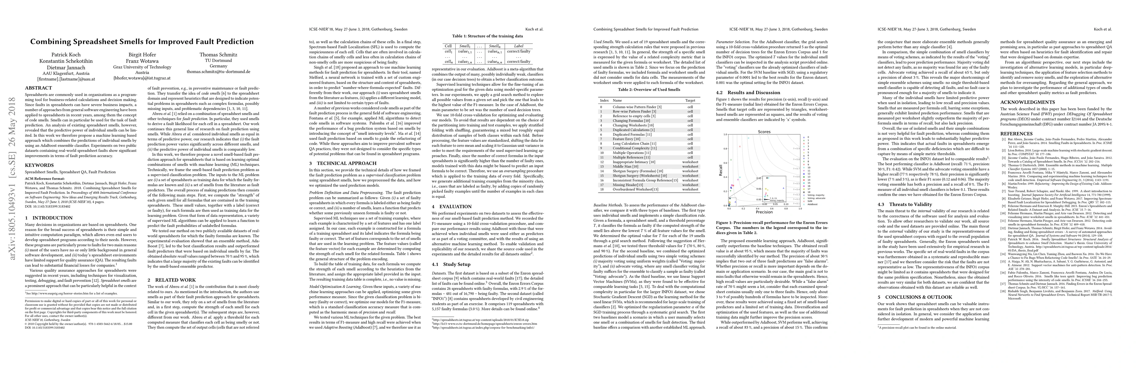 Spreadsheets are commonly used in organizations as a programming tool for business-related calculations and decision making. Since faults in spreadsheets can have severe business impacts, a number of approaches from general software engineering have been applied to spreadsheets in recent years, among them the concept of code smells. Smells can in particular be used for the task of fault prediction. An analysis of existing spreadsheet smells, however, revealed that the predictive power of individual smells can be limited. In this work we therefore propose a machine learning based approach which combines the predictions of individual smells by using an AdaBoost ensemble classifier. Experiments on two public datasets containing real-world spreadsheet faults show significant improvements in terms of fault prediction accuracy.