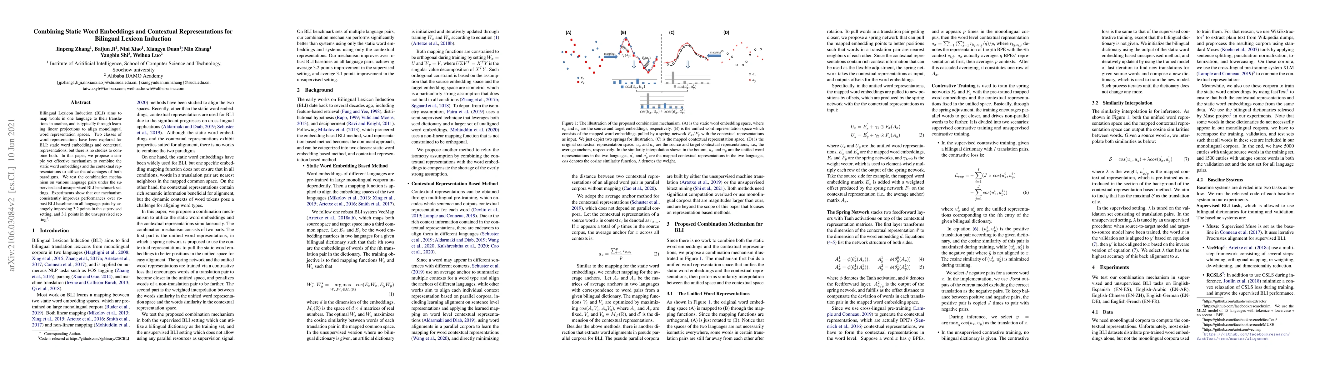 This paper combines static word embeddings and contextual representations to enhance Bilingual Lexicon Induction (BLI), achieving better performance than existing methods in both supervised and unsupervised settings, with average improvements of 3.2 points and 3.1 points respectively.