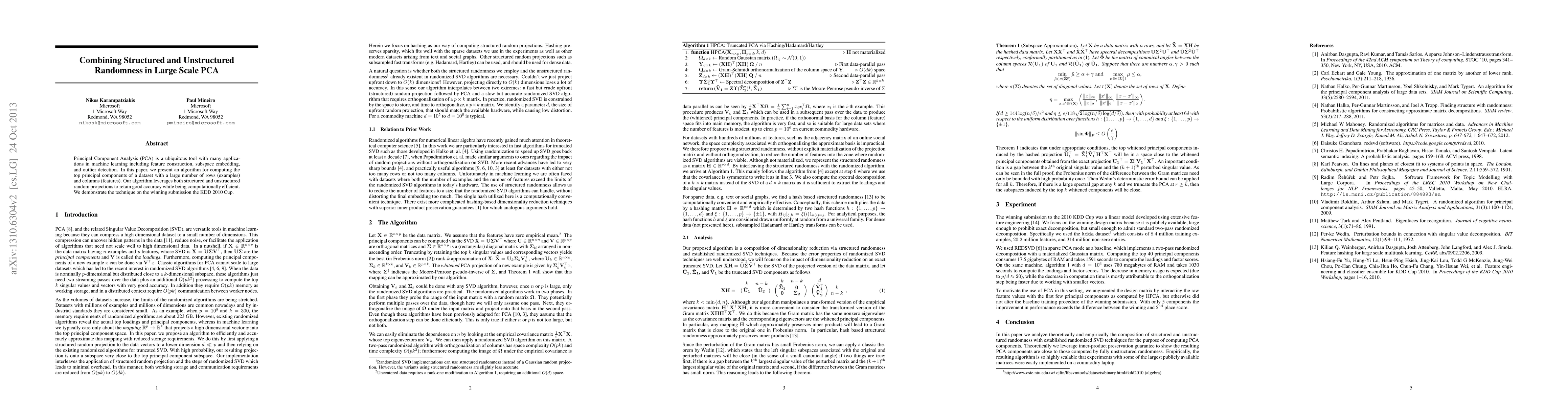 This paper proposes an algorithm for efficiently computing top principal components in large datasets by combining structured and unstructured random projections, achieving high accuracy while maintaining computational efficiency, as demonstrated by its application to the KDD 2010 Cup.