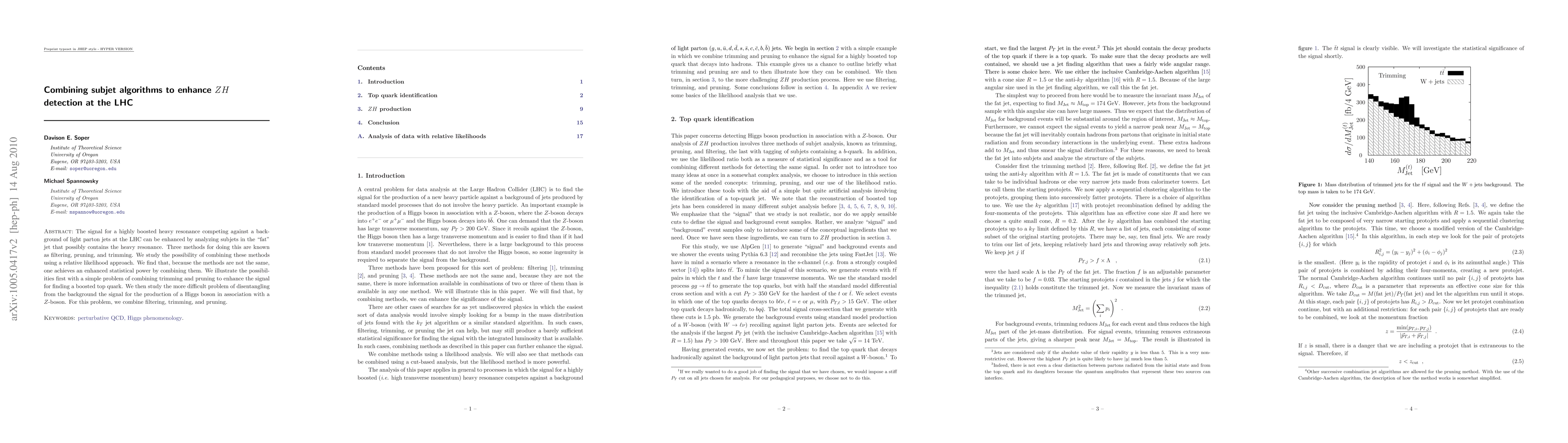This research explores enhancing ZH detection at the LHC by combining subjet algorithms: filtering, pruning, and trimming. The study finds that merging these methods, via a relative likelihood approach, increases statistical power, illustrated first with boosted top quark identification, then with Higgs boson and Z-boson production disentanglement from background noise.