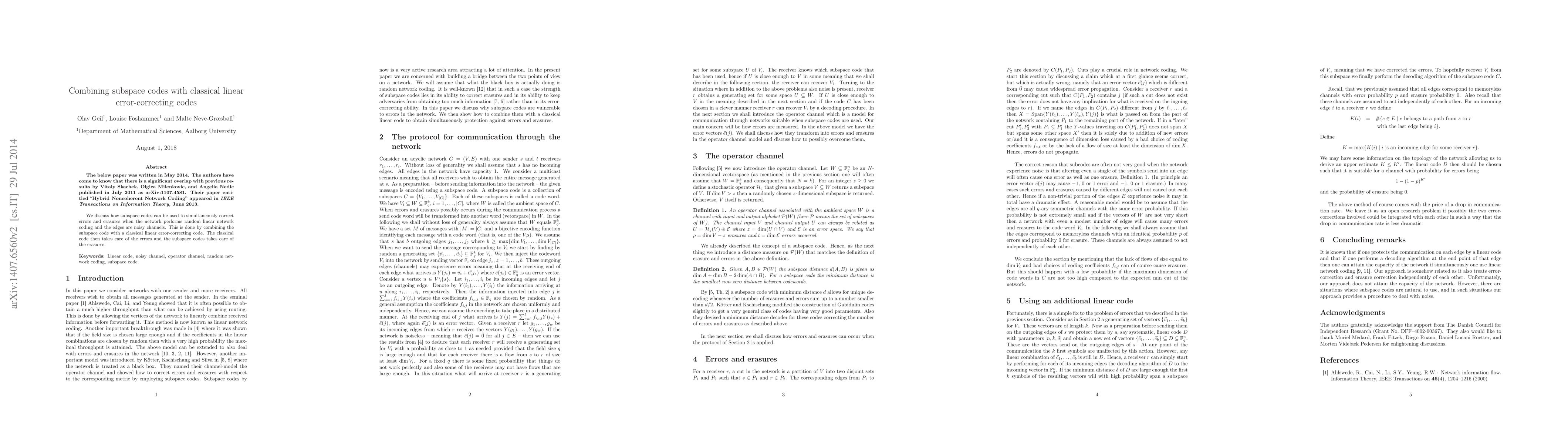 We discuss how subspace codes can be used to simultaneously correct errors and erasures when the network performs random linear network coding and the edges are noisy channels. This is done by combining the subspace code with a classical linear error-correcting code. The classical code then takes care of the errors and the subspace codes takes care of the erasures.