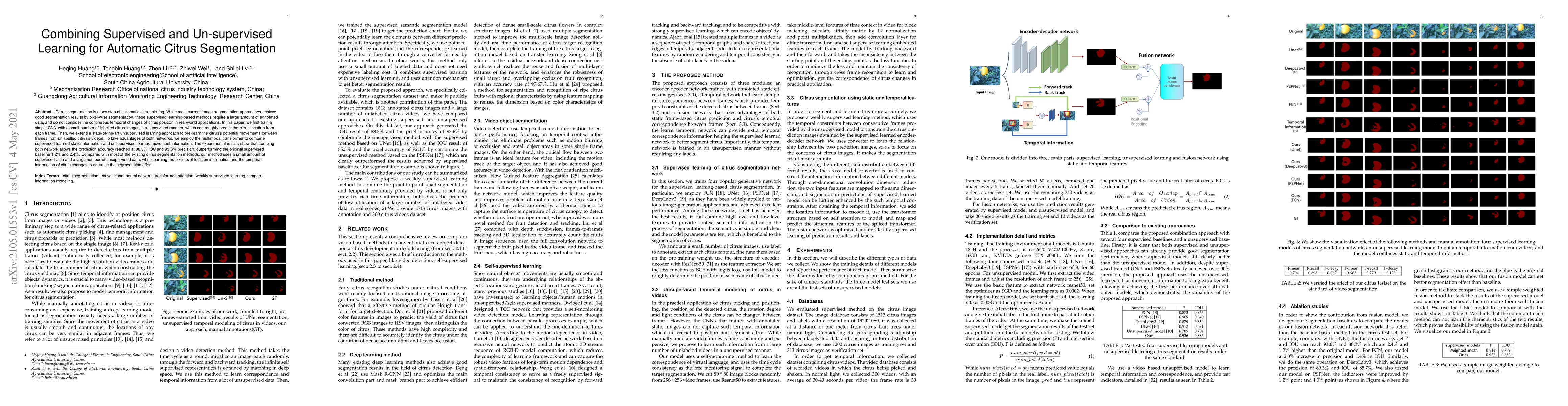 This paper combines supervised and unsupervised learning methods to improve citrus segmentation for automatic picking. It uses a supervised CNN with minimal labeled data and an unsupervised approach to learn citrus movement, then employs a multimodal transformer to integrate both methods, achieving 88.3% IOU and 93.6% precision, outperforming traditional supervised methods.