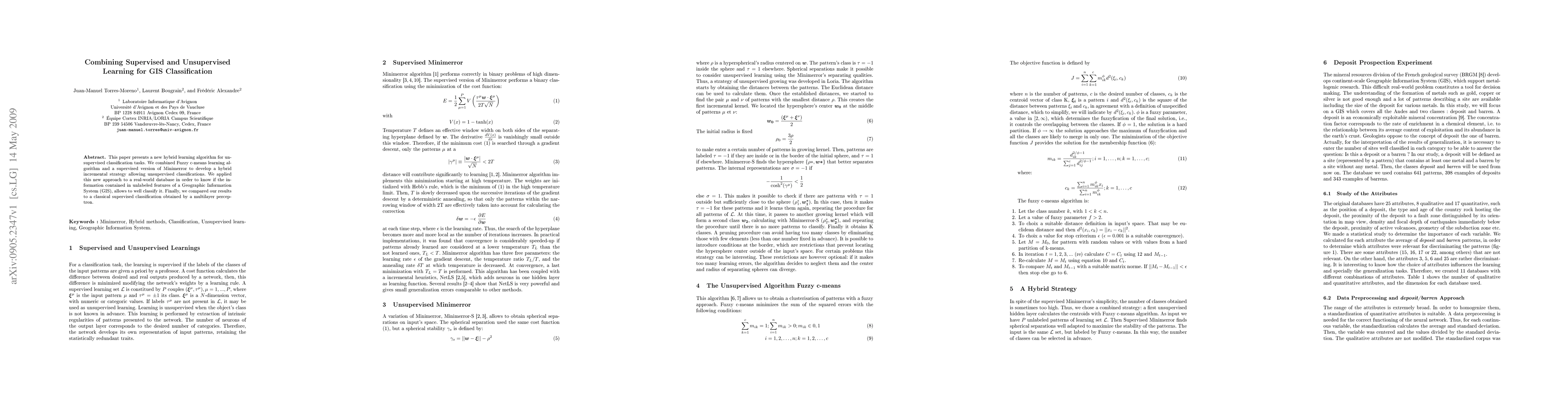 This paper proposes a hybrid learning algorithm combining Fuzzy c-means and supervised Minimerror for GIS classification, showing promising results in unsupervised classification tasks.