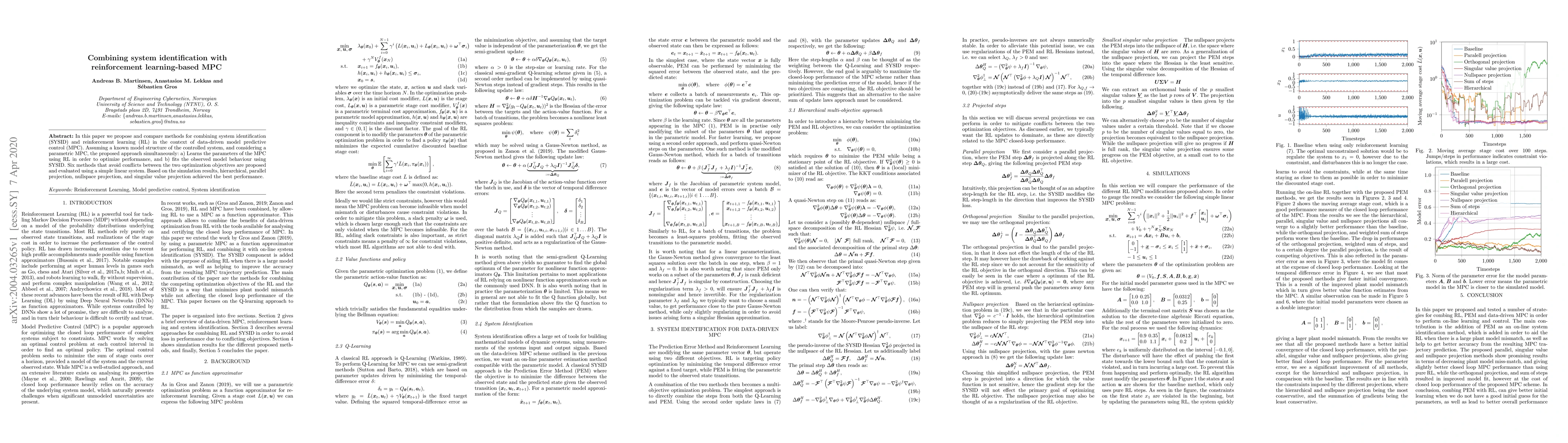 This paper proposes methods to integrate system identification with reinforcement learning for data-driven model predictive control, optimizing both MPC parameters and model behavior. Simulation results show that hierarchical, parallel projection, nullspace projection, and singular value projection methods performed best.