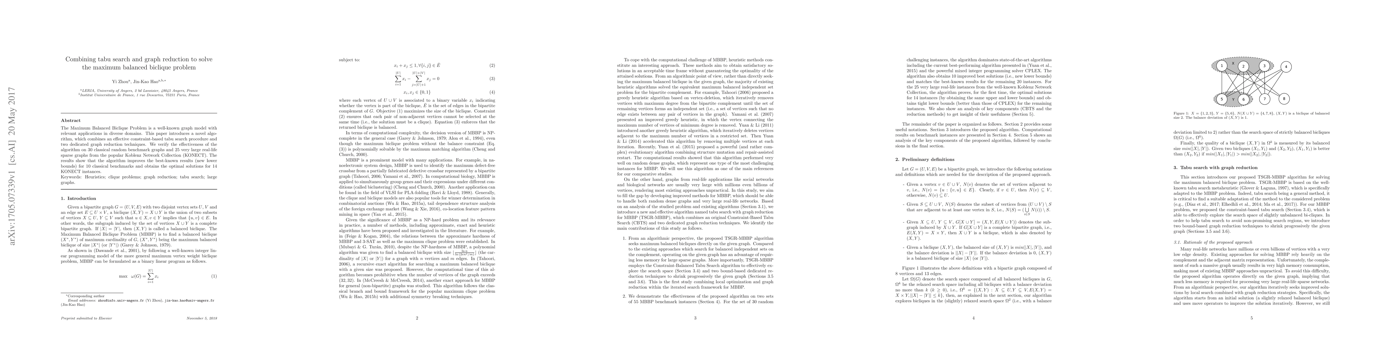 This paper proposes a novel algorithm combining tabu search and graph reduction techniques to solve the Maximum Balanced Biclique Problem, achieving improved results on both classical and large real-life sparse graphs, setting new lower bounds and optimal solutions for several instances.