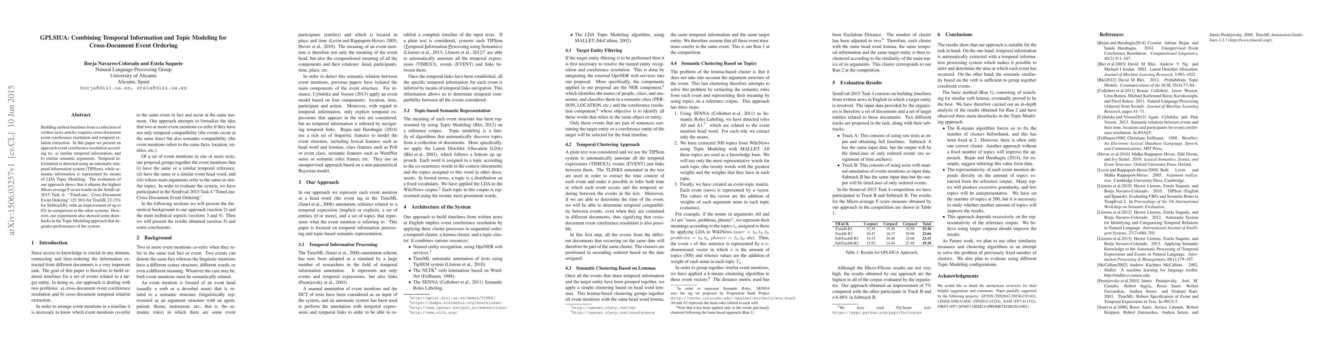 Building unified timelines from a collection of written news articles requires cross-document event coreference resolution and temporal relation extraction. In this paper we present an approach event coreference resolution according to: a) similar temporal information, and b) similar semantic arguments. Temporal information is detected using an automatic temporal information system (TIPSem), while semantic information is represented by means of LDA Topic Modeling. The evaluation of our approach shows that it obtains the highest Micro-average F-score results in the SemEval2015 Task 4: TimeLine: Cross-Document Event Ordering (25.36\% for TrackB, 23.15\% for SubtrackB), with an improvement of up to 6\% in comparison to the other systems. However, our experiment also showed some draw-backs in the Topic Modeling approach that degrades performance of the system.