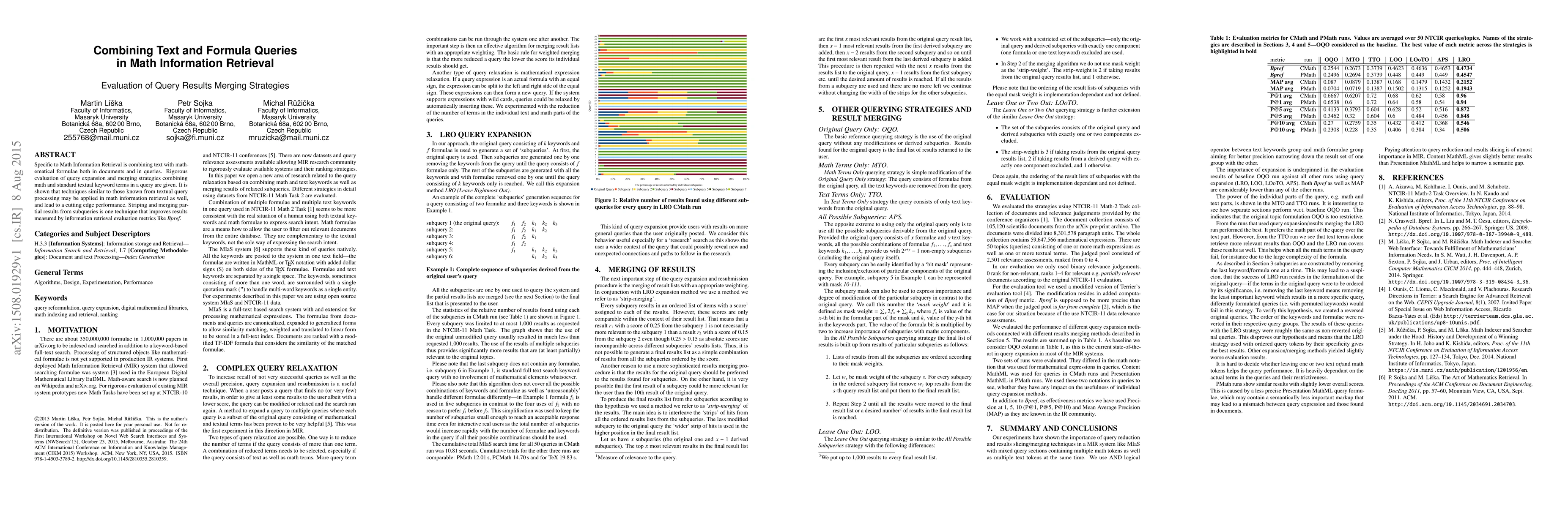 This paper evaluates strategies for merging text and formula queries in Math Information Retrieval, demonstrating that techniques from textual query processing can enhance performance. It finds that merging partial results from subqueries using striping improves results, as measured by metrics like Bpref.