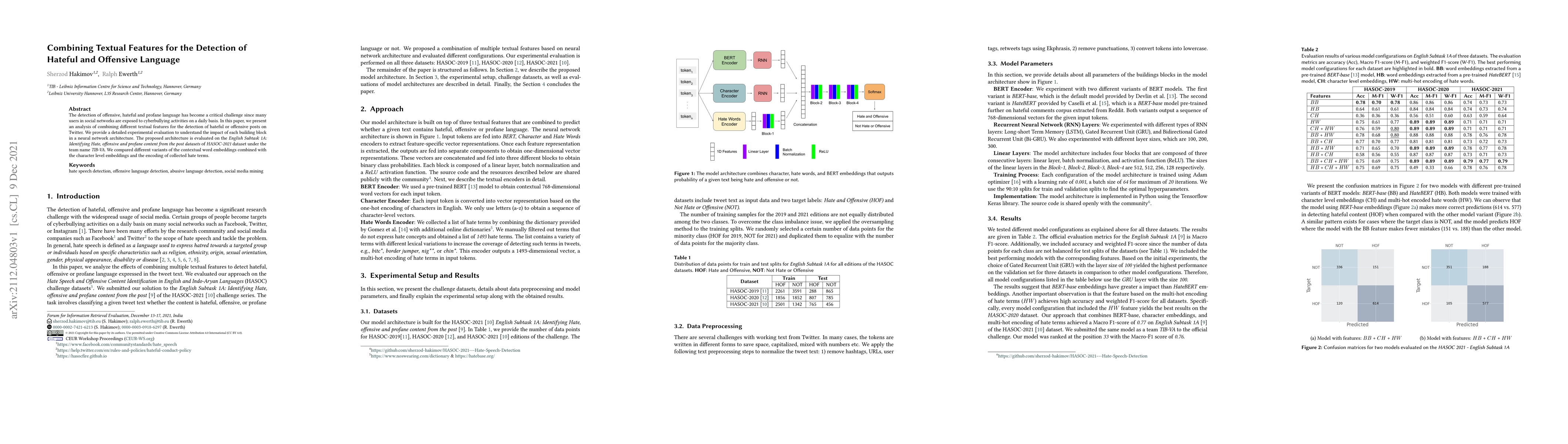 The detection of offensive, hateful and profane language has become a critical challenge since many users in social networks are exposed to cyberbullying activities on a daily basis. In this paper, we present an analysis of combining different textual features for the detection of hateful or offensive posts on Twitter. We provide a detailed experimental evaluation to understand the impact of each building block in a neural network architecture. The proposed architecture is evaluated on the English Subtask 1A: Identifying Hate, offensive and profane content from the post datasets of HASOC-2021 dataset under the team name TIB-VA. We compared different variants of the contextual word embeddings combined with the character level embeddings and the encoding of collected hate terms.