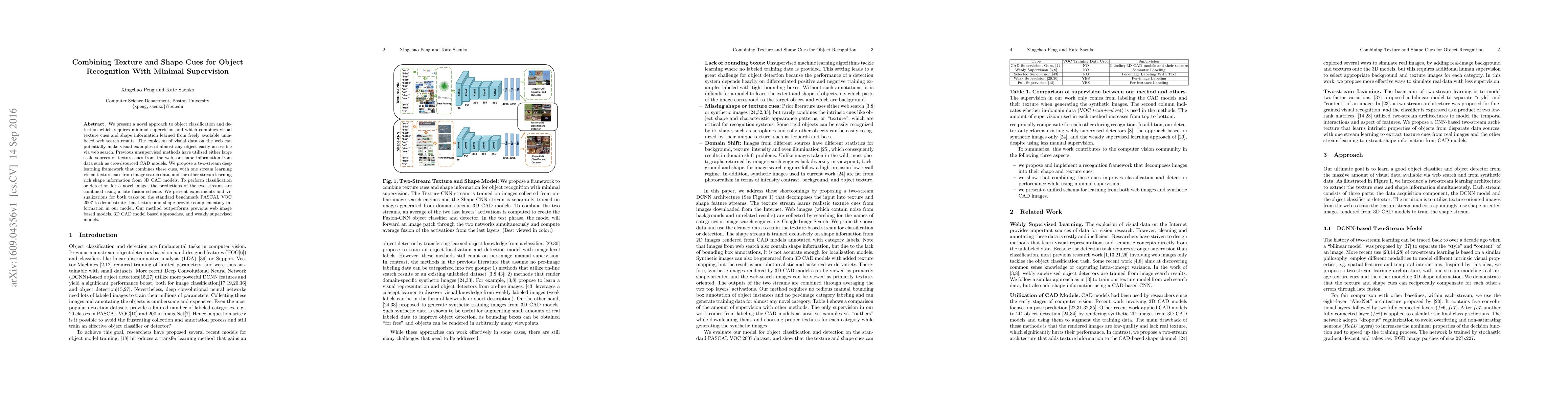 This paper introduces a novel deep learning framework that combines texture and shape cues for object recognition with minimal supervision, leveraging unlabeled web image search results and 3D CAD models. The proposed method outperforms previous models by integrating complementary information from both visual texture and shape.