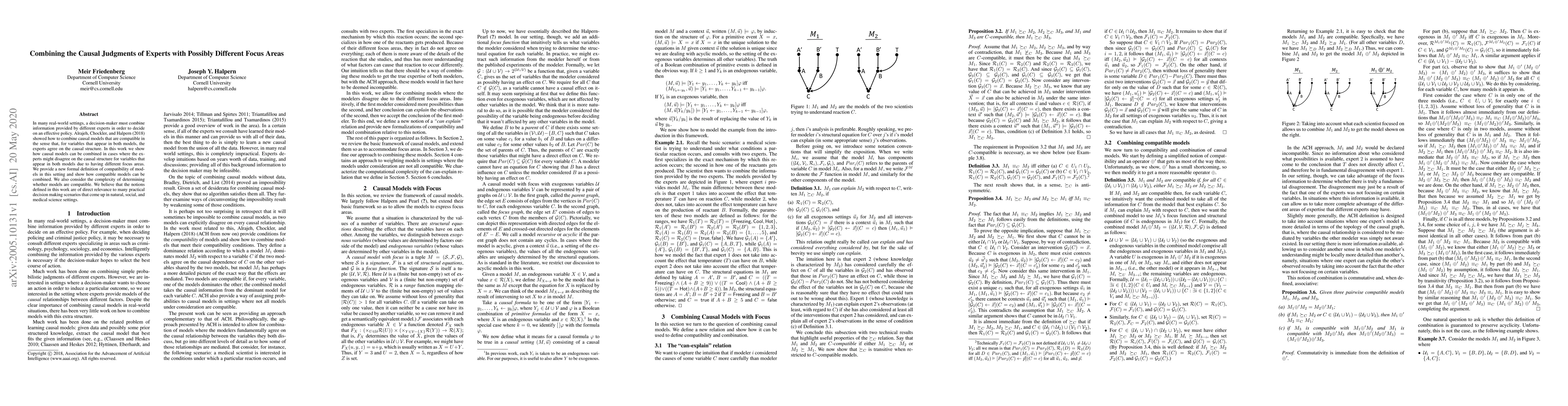 In many real-world settings, a decision-maker must combine information provided by different experts in order to decide on an effective policy. Alrajeh, Chockler, and Halpern [2018] showed how to combine causal models that are compatible in the sense that, for variables that appear in both models, the experts agree on the causal structure. In this work we show how causal models can be combined in cases where the experts might disagree on the causal structure for variables that appear in both models due to having different focus areas. We provide a new formal definition of compatibility of models in this setting and show how compatible models can be combined. We also consider the complexity of determining whether models are compatible. We believe that the notions defined in this work are of direct relevance to many practical decision making scenarios that come up in natural, social, and medical science settings.