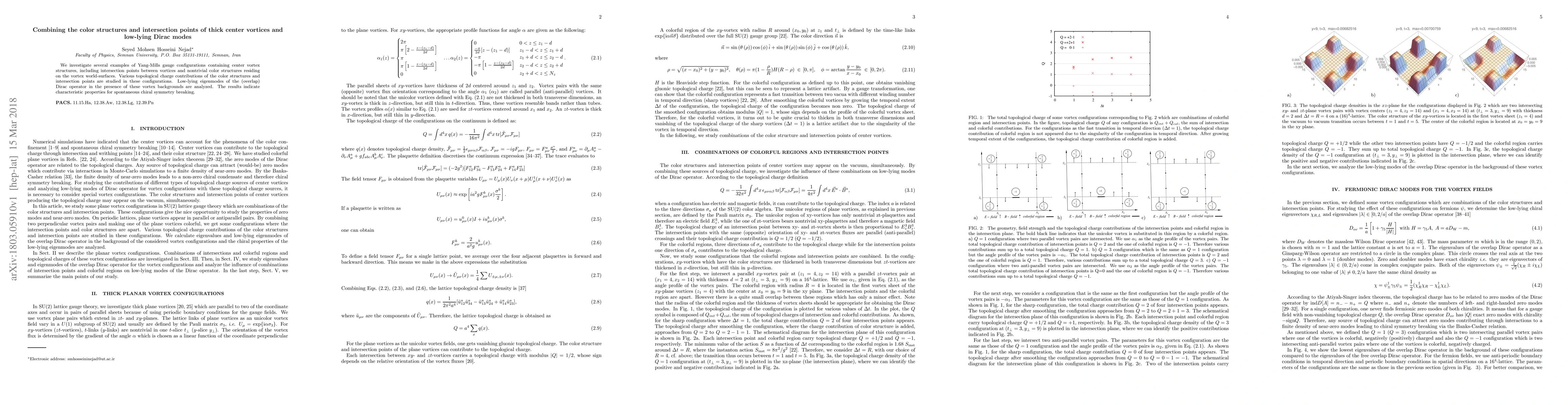 We investigate several examples of Yang-Mills gauge configurations containing center vortex structures, including intersection points between vortices and nontrivial color structures residing on the vortex world-surfaces. Various topological charge contributions of the color structures and intersection points are studied in these configurations. Low-lying eigenmodes of the (overlap) Dirac operator in the presence of these vortex backgrounds are analyzed. The results indicate characteristic properties for spontaneous chiral symmetry breaking.