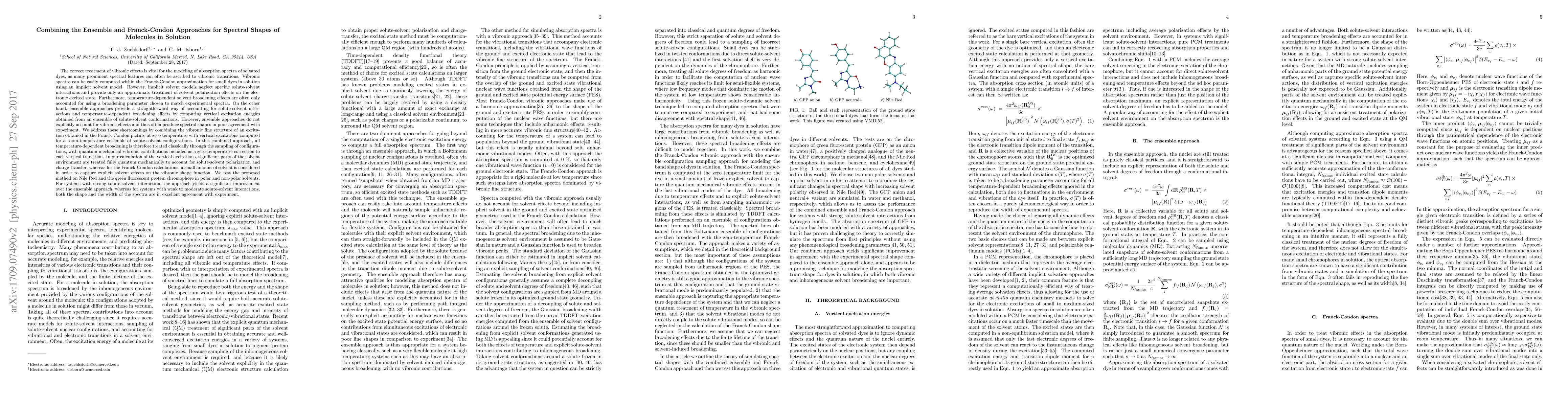 This paper combines the Franck-Condon and ensemble approaches to model the absorption spectra of solvated dyes, addressing the limitations of each method. The proposed hybrid method yields improved spectral shapes and widths in agreement with experimental data, especially for systems with strong solute-solvent interactions.