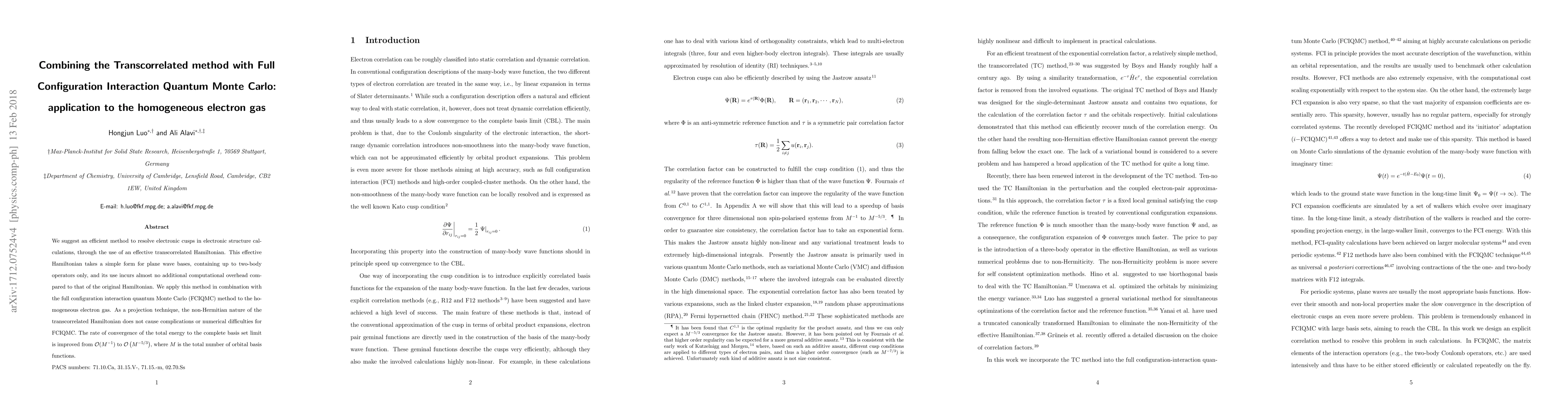 This paper proposes an efficient transcorrelated Hamiltonian to resolve electronic cusps in electronic structure calculations, which is applied with the full configuration interaction quantum Monte Carlo (FCIQMC) method to the homogeneous electron gas, significantly improving convergence rate from ${\cal O}(M^{-1})$ to ${\cal O}(M^{-5/3})$.