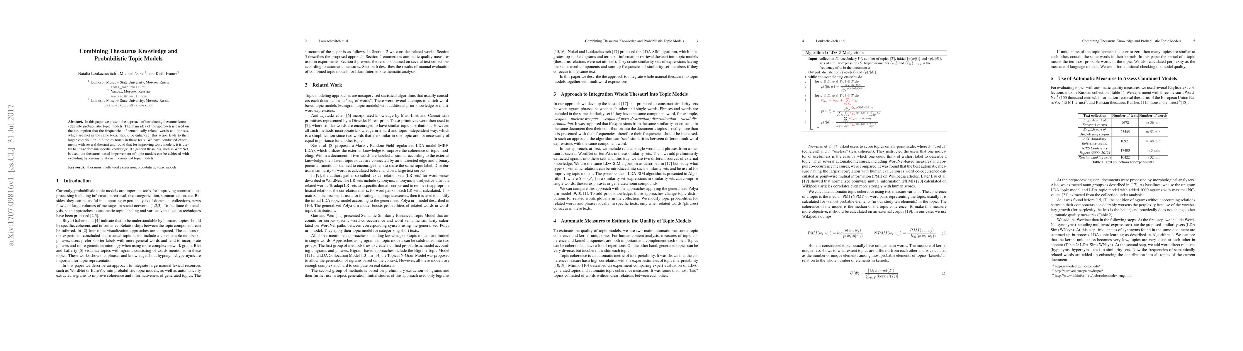 In this paper we present the approach of introducing thesaurus knowledge into probabilistic topic models. The main idea of the approach is based on the assumption that the frequencies of semantically related words and phrases, which are met in the same texts, should be enhanced: this action leads to their larger contribution into topics found in these texts. We have conducted experiments with several thesauri and found that for improving topic models, it is useful to utilize domain-specific knowledge. If a general thesaurus, such as WordNet, is used, the thesaurus-based improvement of topic models can be achieved with excluding hyponymy relations in combined topic models.