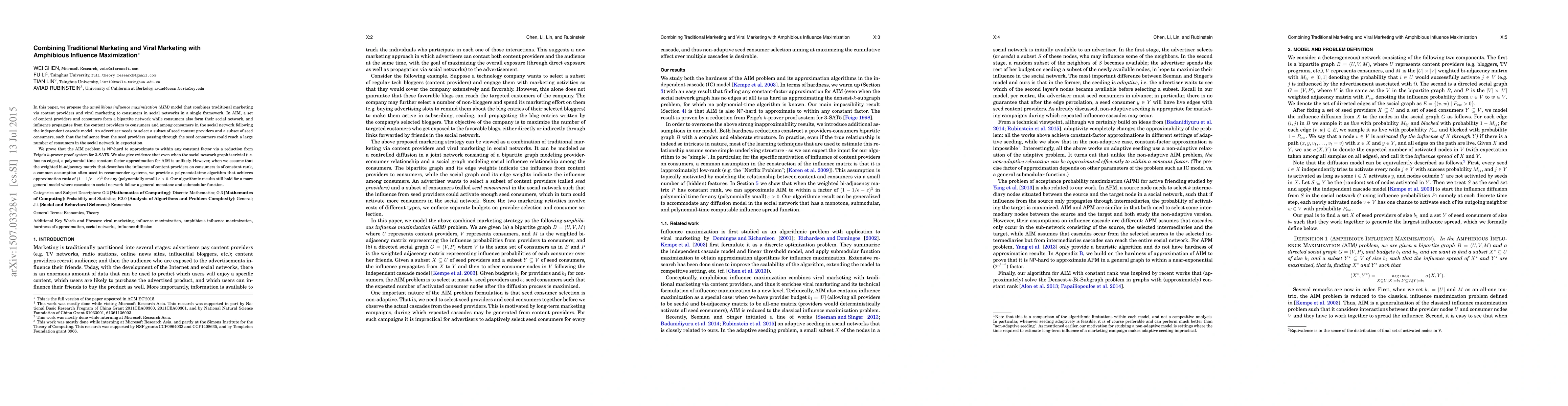 This paper introduces the amphibious influence maximization (AIM) model, which integrates traditional marketing and viral marketing in social networks. The AIM model selects seed content providers and consumers to maximize influence spread, proving the problem is NP-hard but providing a polynomial-time algorithm with a specific approximation ratio under certain conditions.
