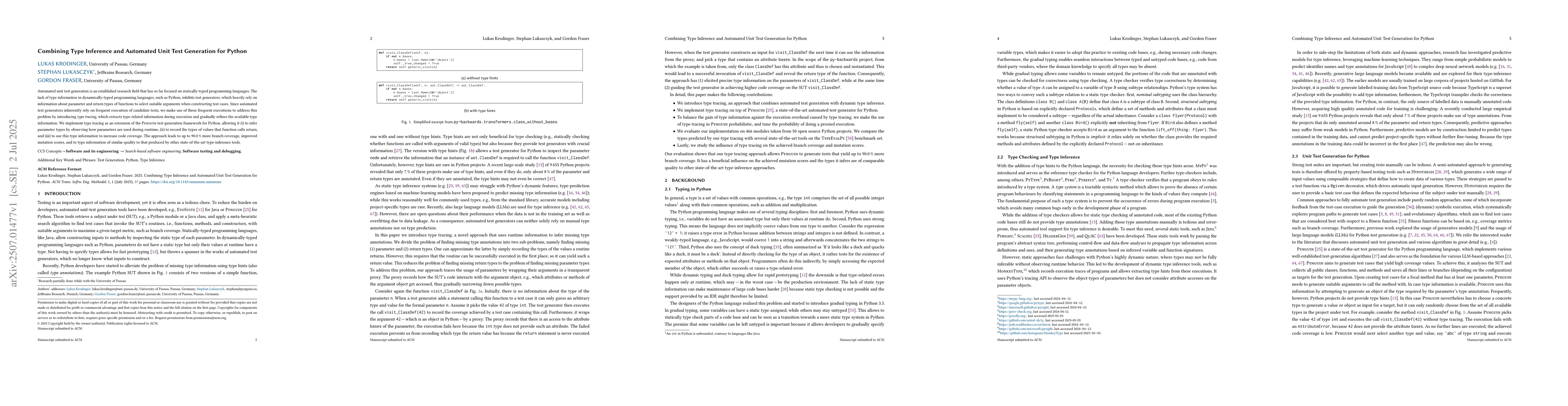 Automated unit test generation is an established research field that has so far focused on statically-typed programming languages. The lack of type information in dynamically-typed programming languages, such as Python, inhibits test generators, which heavily rely on information about parameter and return types of functions to select suitable arguments when constructing test cases. Since automated test generators inherently rely on frequent execution of candidate tests, we make use of these frequent executions to address this problem by introducing type tracing, which extracts type-related information during execution and gradually refines the available type information. We implement type tracing as an extension of the Pynguin test-generation framework for Python, allowing it (i) to infer parameter types by observing how parameters are used during runtime, (ii) to record the types of values that function calls return, and (iii) to use this type information to increase code coverage. The approach leads to up to 90.0% more branch coverage, improved mutation scores, and to type information of similar quality to that produced by other state-of-the-art type-inference tools.