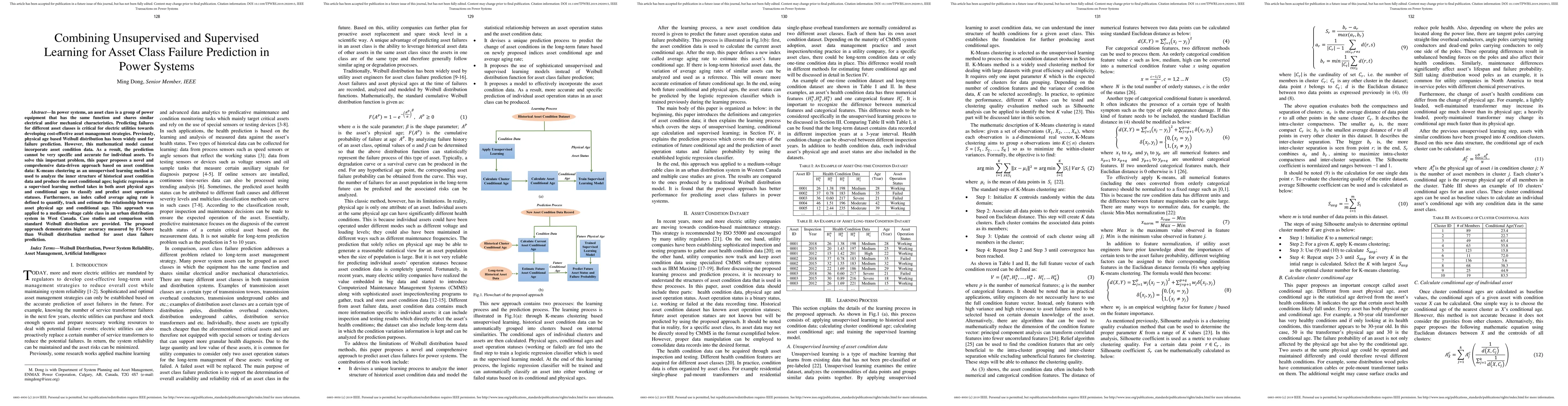 This paper proposes a hybrid approach combining unsupervised and supervised learning to predict asset class failures in power systems, using K-means clustering for data analysis and logistic regression for classification. The method outperforms traditional Weibull distribution by incorporating asset condition data for more accurate predictions.