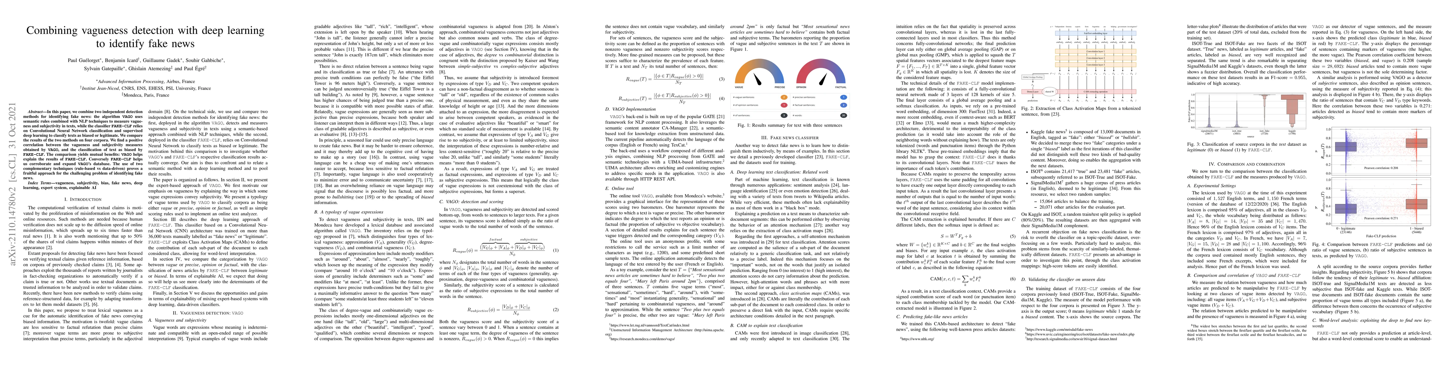 This paper combines rule-based vagueness detection (VAGO) and deep learning (FAKE-CLF) to identify fake news, showing a positive correlation between vagueness measures and biased text classification. The study finds that both methods mutually enhance each other’s effectiveness in detecting fake news.