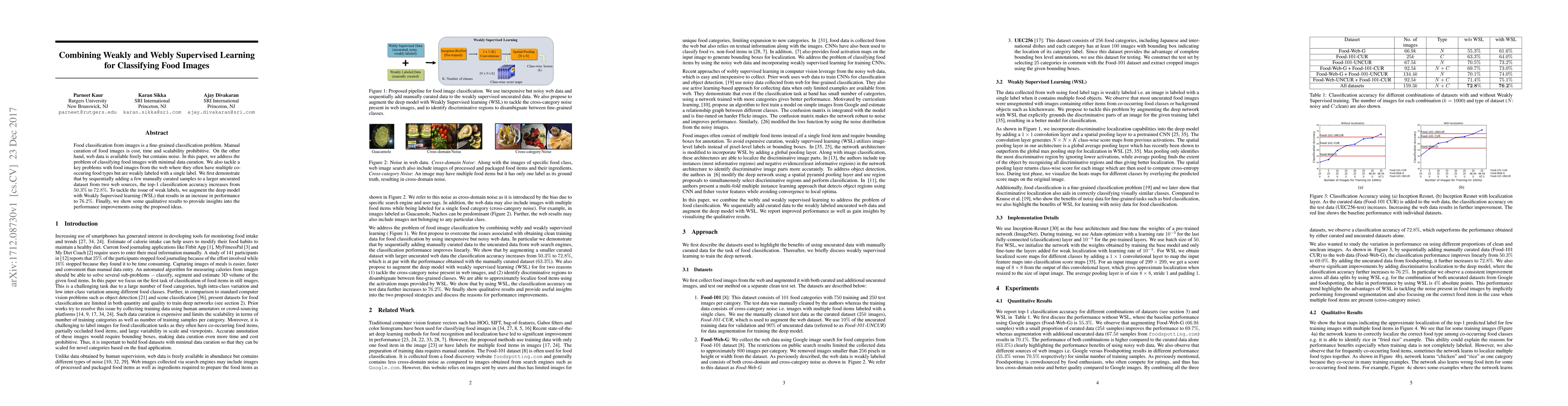 This paper explores combining weakly and webly supervised learning to classify food images, addressing the challenge of minimal data curation. By integrating a few curated samples with a larger web-sourced dataset, the authors achieve a significant increase in classification accuracy, further enhanced by Weakly Supervised learning techniques.