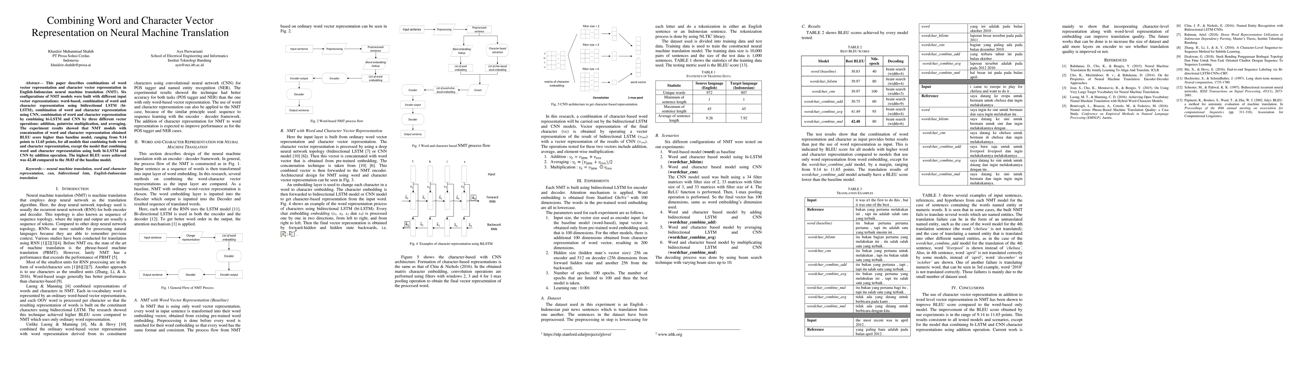 This paper explores various configurations of neural machine translation models combining word and character vector representations for English-Indonesian translation, achieving higher BLEU scores than the baseline model, with the best model achieving a BLEU score of 42.48.