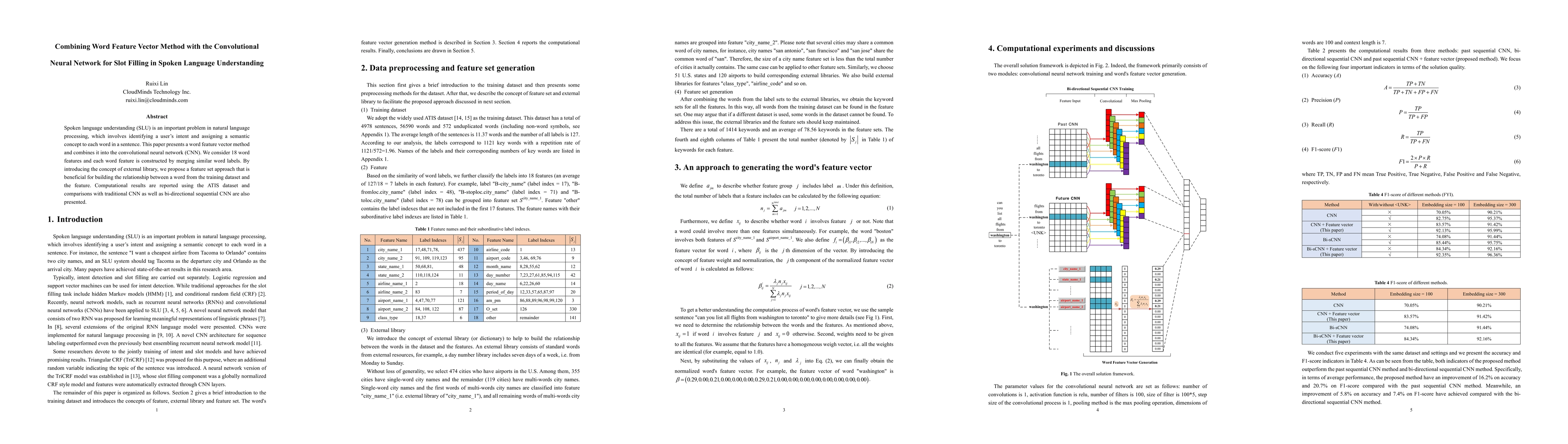 This research paper proposes a method that integrates a word feature vector approach with a convolutional neural network (CNN) for slot filling in Spoken Language Understanding. The paper demonstrates improved performance by combining 18 word features, constructed through merging similar word labels, with a CNN, and reports results using the ATIS dataset, comparing it with traditional CNN and bi-directional sequential CNN methods.