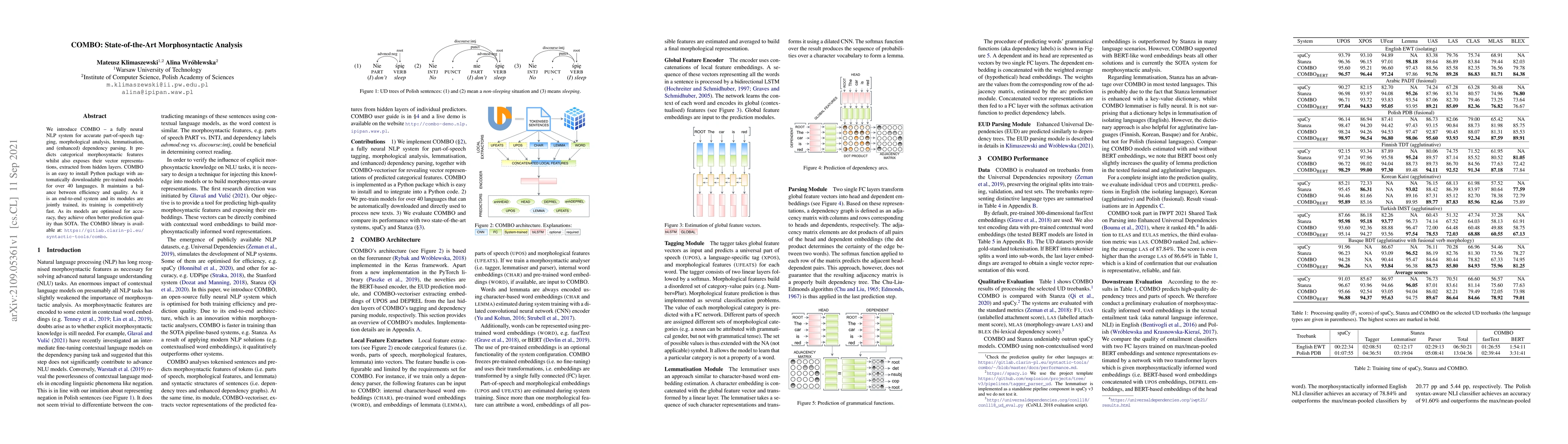 COMBO is a fully neural NLP system that performs morphosyntactic analysis, including part-of-speech tagging, morphological analysis, lemmatisation, and enhanced dependency parsing, achieving competitive accuracy and fast training. The Python package offers pre-trained models for over 40 languages.