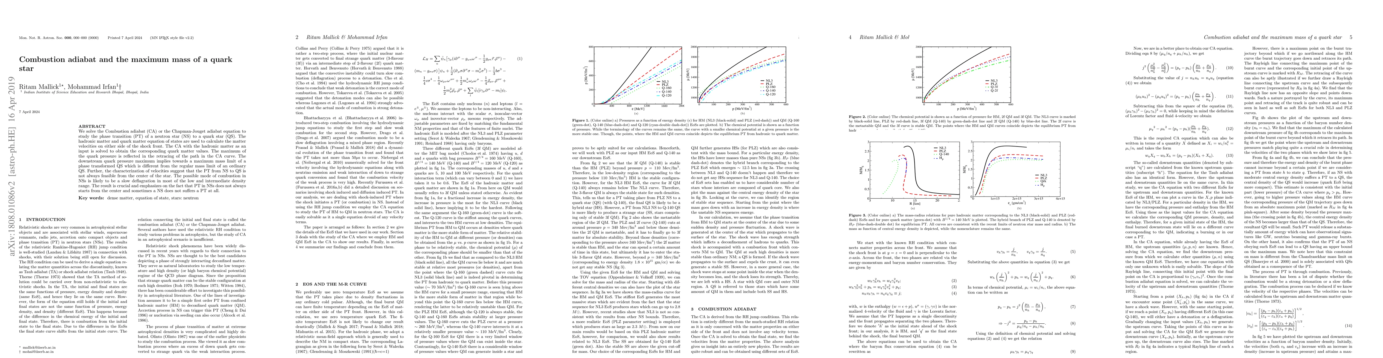 We solve the Combustion adiabat (CA) or the Chapman-Jouget adiabat equation to study the phase transition (PT) of a neutron star (NS) to a quark star (QS). The hadronic matter and quark matter equation of states are used to calculate the matter velocities on either side of the shock front. The CA with the hadronic matter as an input is solved to obtain the corresponding quark matter values. The maximum of the quark pressure is reflected in the retracing of the path in the CA curve. The downstream quark pressure maximum implies towards a maximum mass limit of a phase transformed QS which is different from the regular mass limit of an ordinary QS. Further, the characterization of velocities suggest that the PT from NS to QS is not always feasible from the center of the star. The possible mode of combustion in NSs is likely to be a slow deflagration in most of the low and intermediate density range. The result is crucial and emphasizes on the fact that PT in NSs does not always starts from the center and sometimes a NS does not suffers a PT at all.