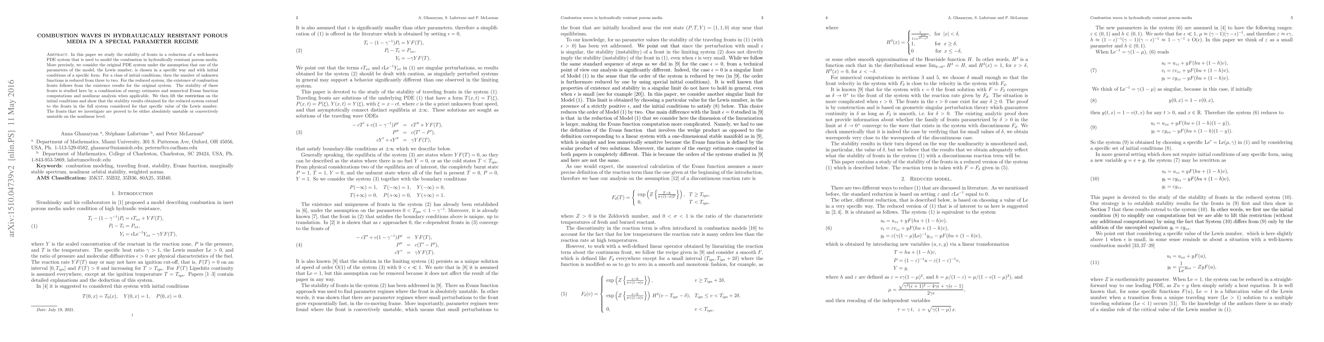 The study examines combustion waves in hydraulically resistant porous media using a PDE system, focusing on a specific parameter regime where the Lewis number is chosen in a particular way with specific initial conditions.