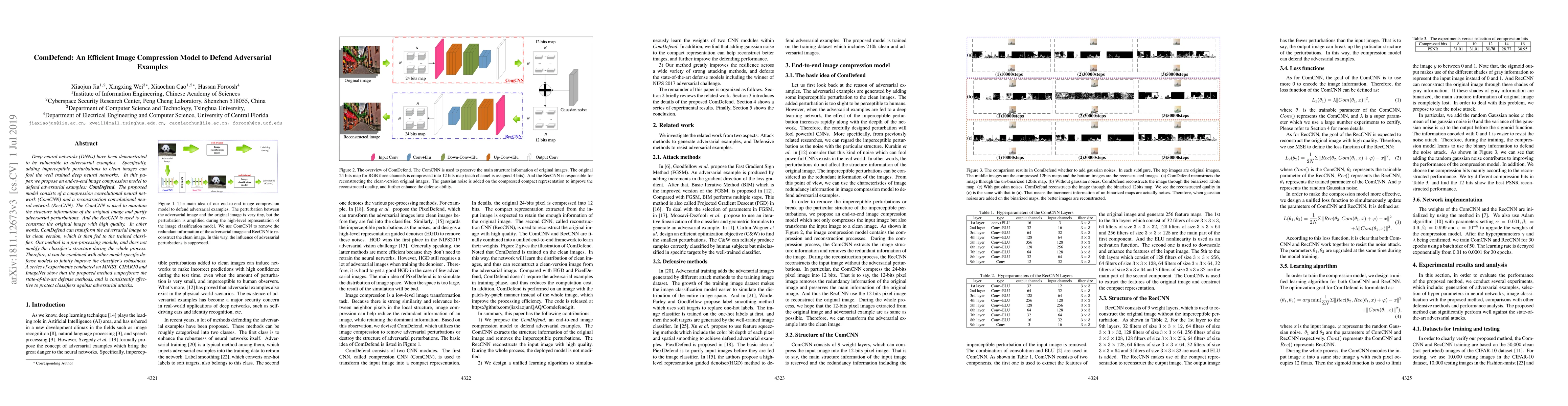 ComDefend proposes an efficient image compression model to defend against adversarial examples by using a compression CNN to purify perturbations and a reconstruction CNN to restore the original image. Experiments show it outperforms existing methods in protecting classifiers against adversarial attacks.
