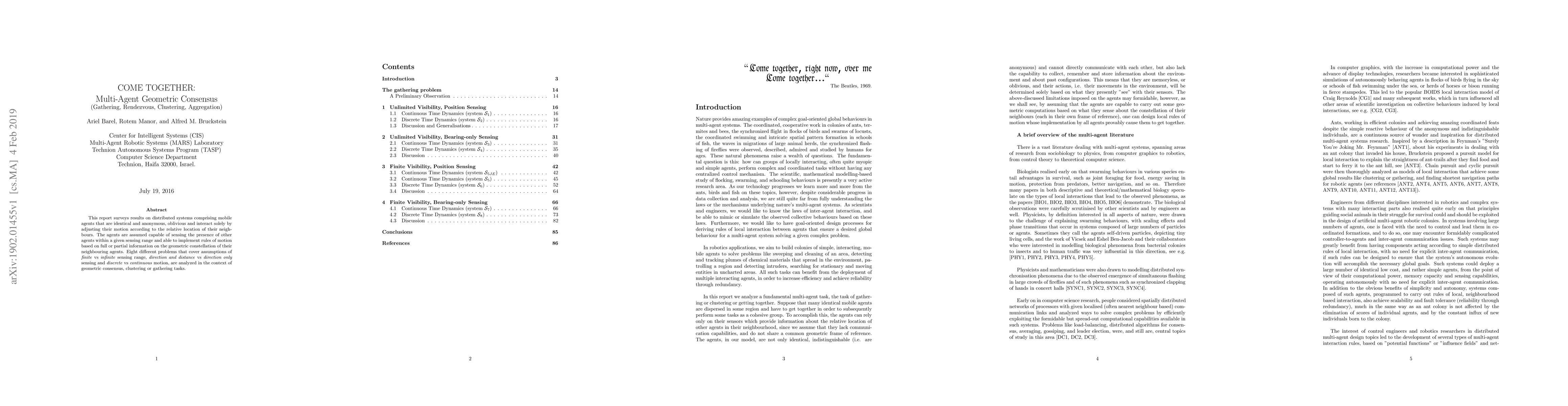 This report surveys results on distributed systems comprising mobile agents that are identical and anonymous, oblivious and interact solely by adjusting their motion according to the relative location of their neighbours. The agents are assumed capable of sensing the presence of other agents within a given sensing range and able to implement rules of motion based on full or partial information on the geometric constellation of their neighbouring agents. Eight different problems that cover assumptions of finite vs infinite sensing range, direction and distance vs direction only sensing and discrete vs continuous motion, are analyzed in the context of geometric consensus, clustering or gathering tasks.