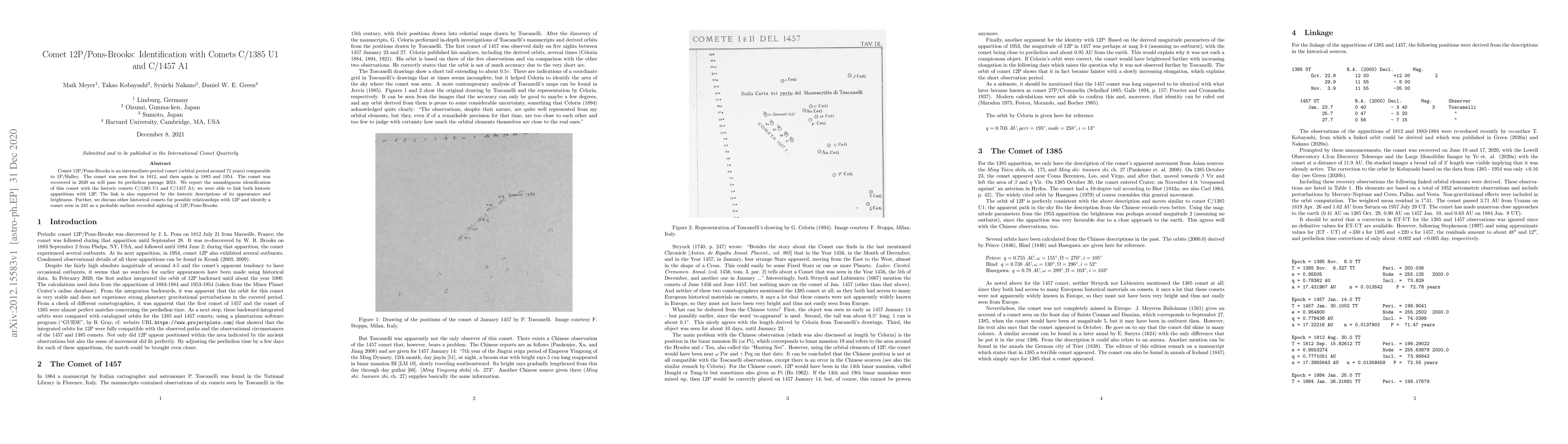 This paper identifies Comet 12P/Pons-Brooks with the historic comets C/1385 U1 and C/1457 A1 based on orbital and observational evidence, suggesting a long-term periodicity and possible earlier sightings dating back to 245. The study supports these connections through detailed analysis of historical records and cometary appearances.
