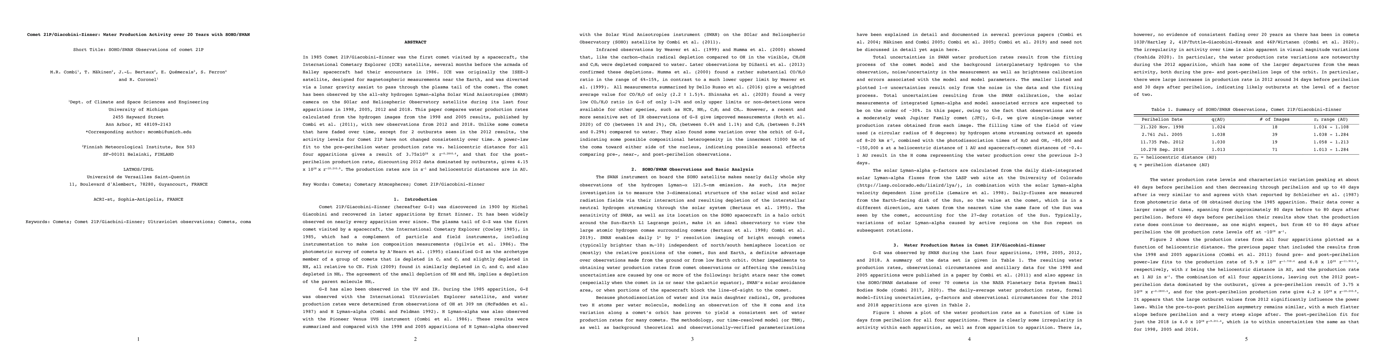 The paper presents an advanced methodology for deriving water production rates from SOHO/SWAN hydrogen Lyman-alpha observations, allowing for a 20-year comparison of Comet 21P/Giacobini-Zinner's activity.