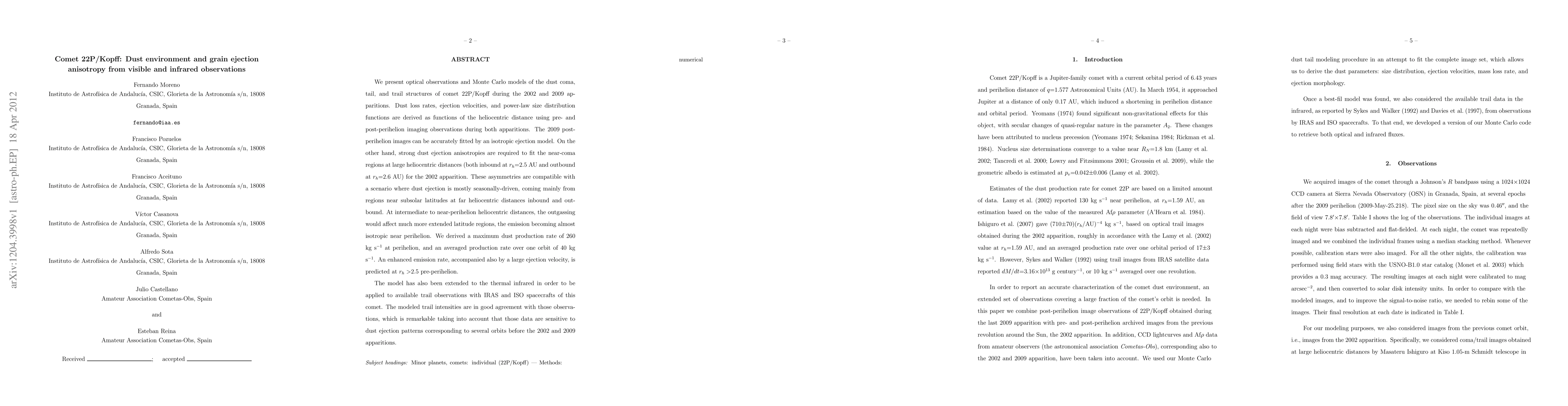 We present optical observations and Monte Carlo models of the dust coma, tail, and trail structures of comet 22P/Kopff during the 2002 and 2009 apparitions. Dust loss rates, ejection velocities, and power-law size distribution functions are derived as functions of the heliocentric distance using pre- and post-perihelion imaging observations during both apparitions. The 2009 post-perihelion images can be accurately fitted by an isotropic ejection model. On the other hand, strong dust ejection anisotropies are required to fit the near-coma regions at large heliocentric distances (both inbound at $r_h$=2.5 AU and outbound at $r_h$=2.6 AU) for the 2002 apparition. These asymmetries are compatible with a scenario where dust ejection is mostly seasonally-driven, coming mainly from regions near subsolar latitudes at far heliocentric distances inbound and outbound. At intermediate to near-perihelion heliocentric distances, the outgassing would affect much more extended latitude regions, the emission becoming almost isotropic near perihelion. We derived a maximum dust production rate of 260 kg s$^{-1}$ at perihelion, and an averaged production rate over one orbit of 40 kg s$^{-1}$. An enhanced emission rate, accompanied also by a large ejection velocity, is predicted at $r_h>$2.5 pre-perihelion. The model has also been extended to the thermal infrared in order to be applied to available trail observations with IRAS and ISO spacecrafts of this comet. The modeled trail intensities are in good agreement with those observations, which is remarkable taking into account that those data are sensitive to dust ejection patterns corresponding to several orbits before the 2002 and 2009 apparitions.